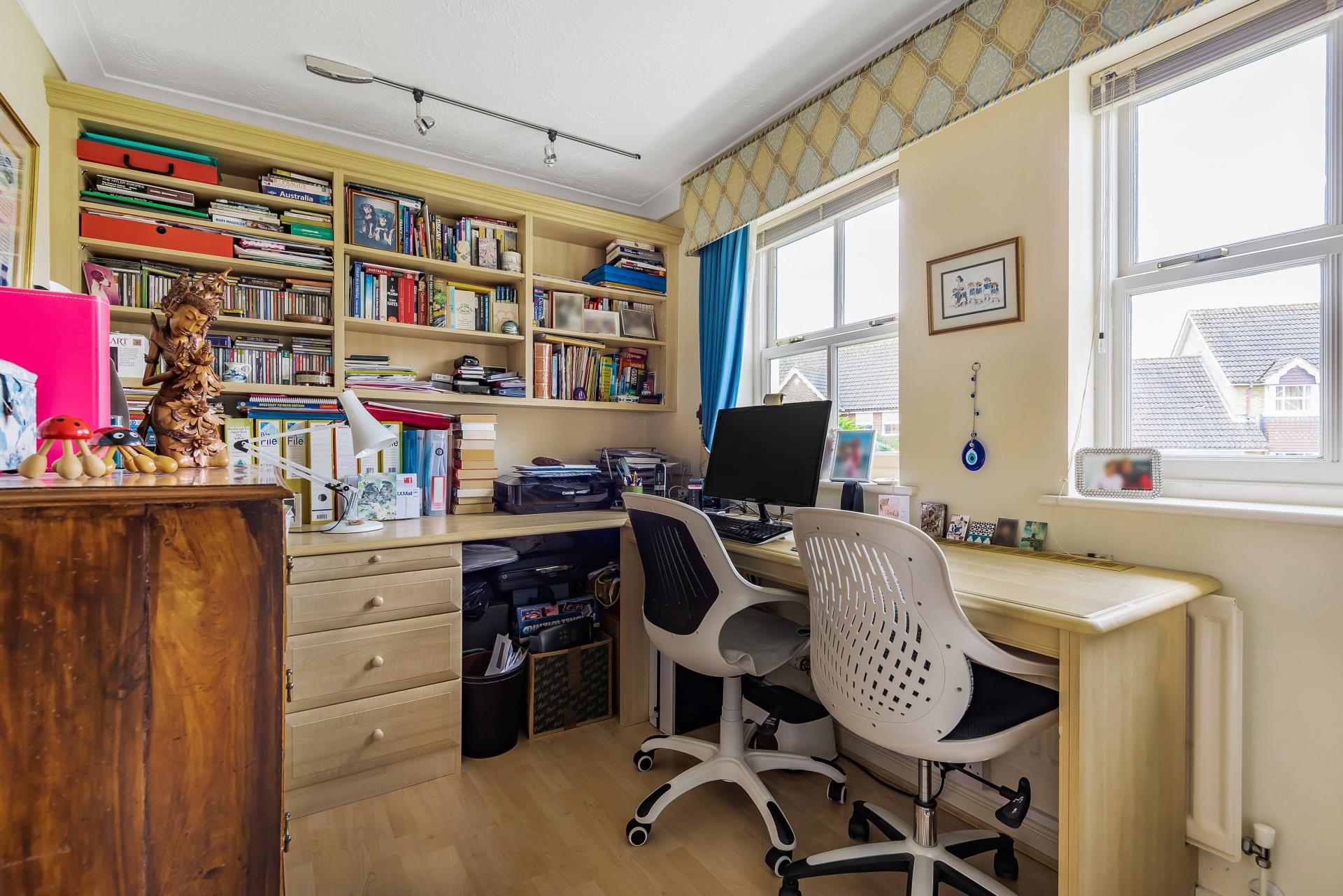 Bedroom 3 : Double bedroom with beech laminate flooring fitted for a home office with a range of shelves and desk. Built-in wardrobe, radiator and light point.