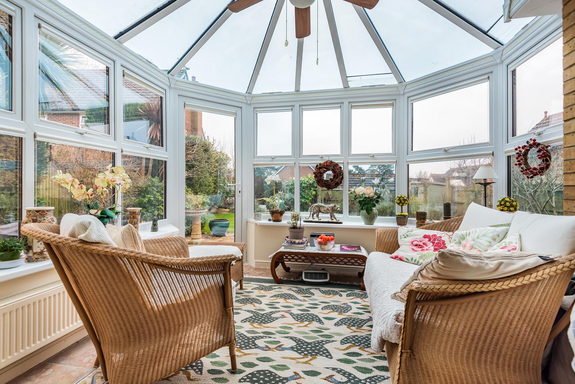 Conservatory : Overlooking the charming garden with radiator and tiled floor. Doors out to the garden.