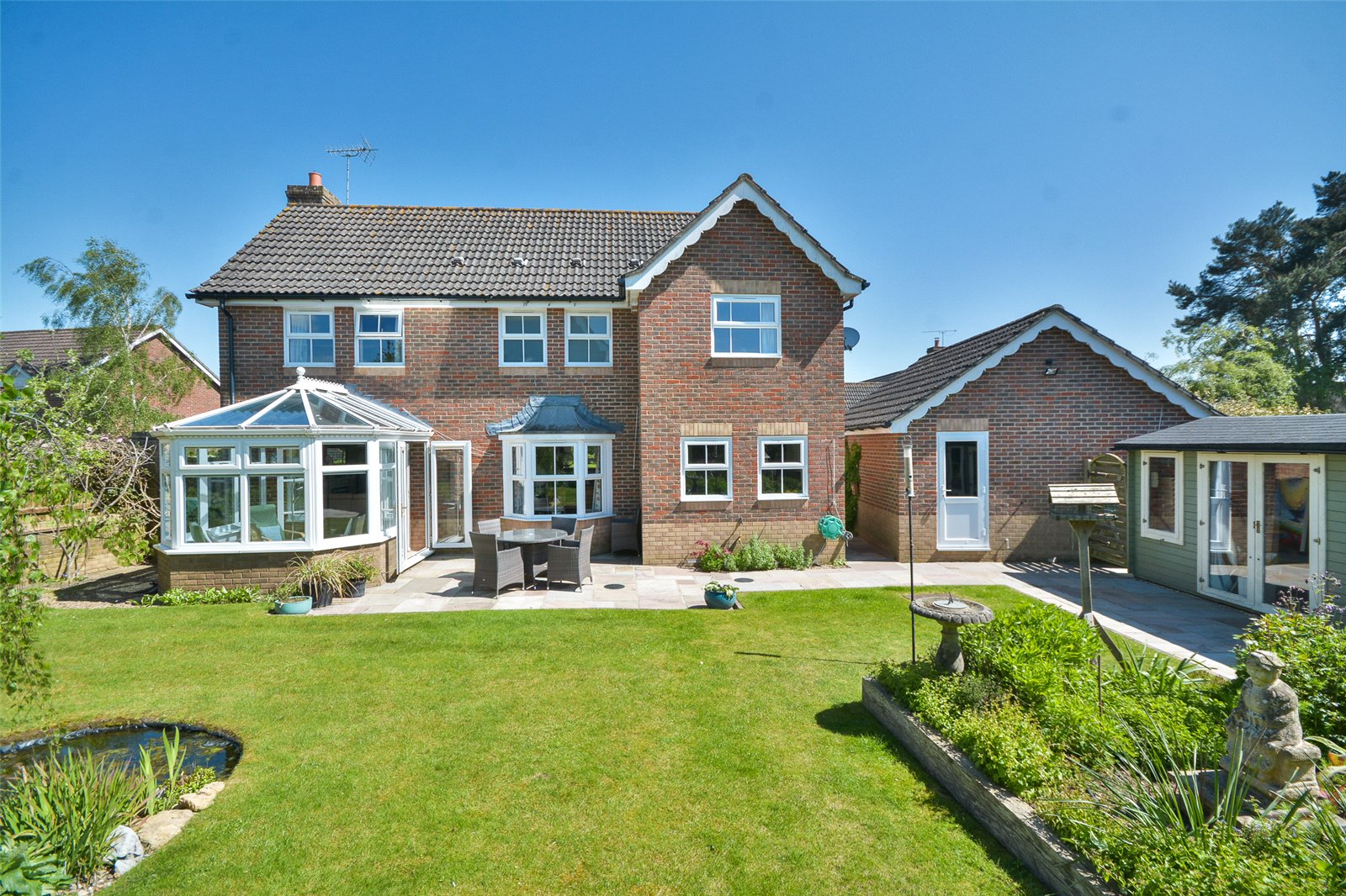 A bright and superbly presented family home with handsome brick elevations and spacious large double garage. Lovely interior and a neat, landscaped garden with studio.
