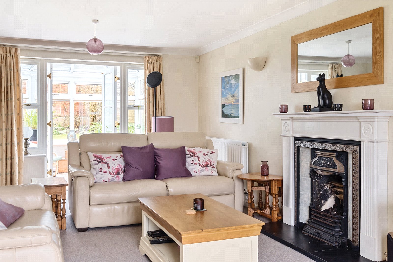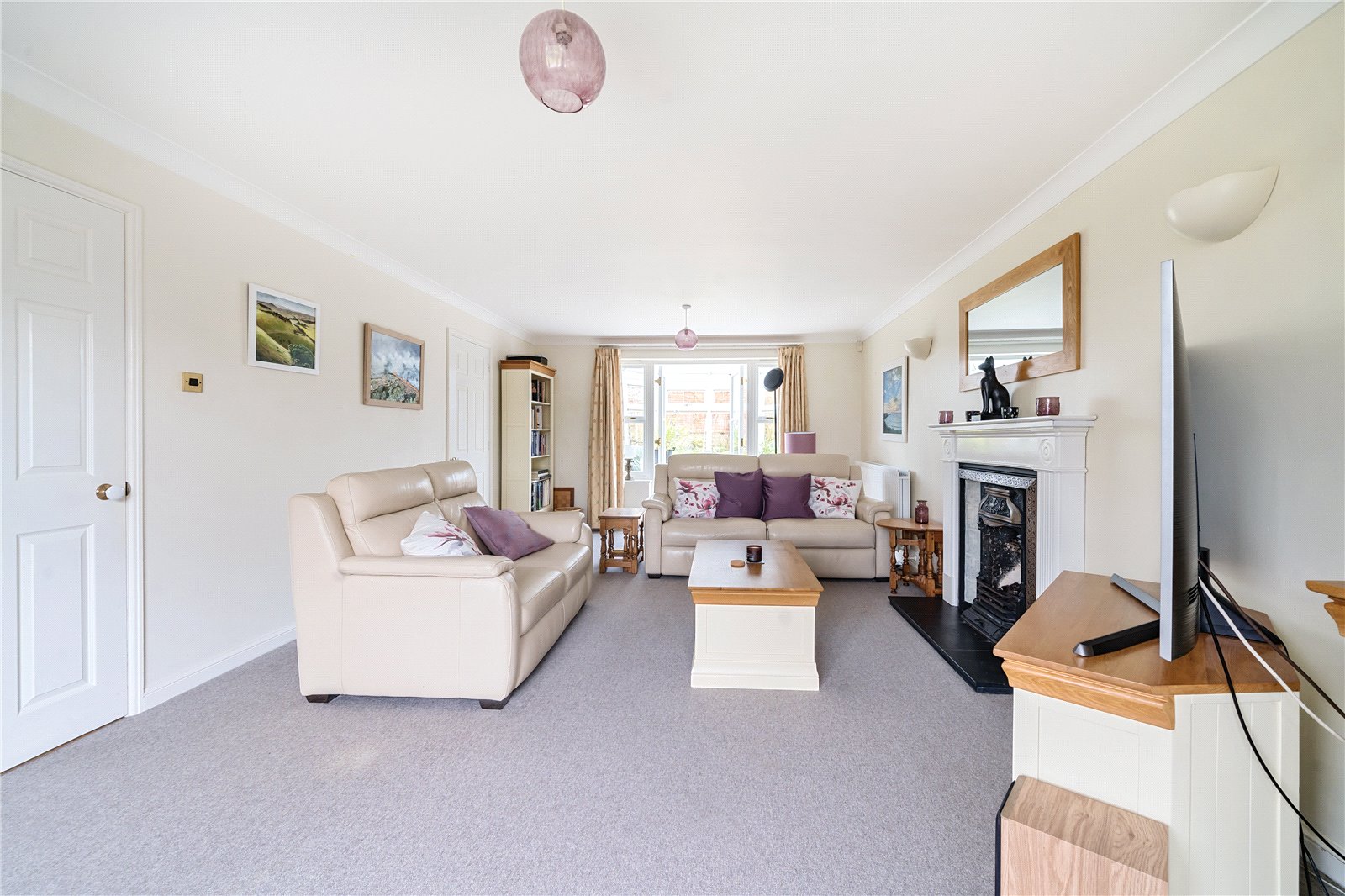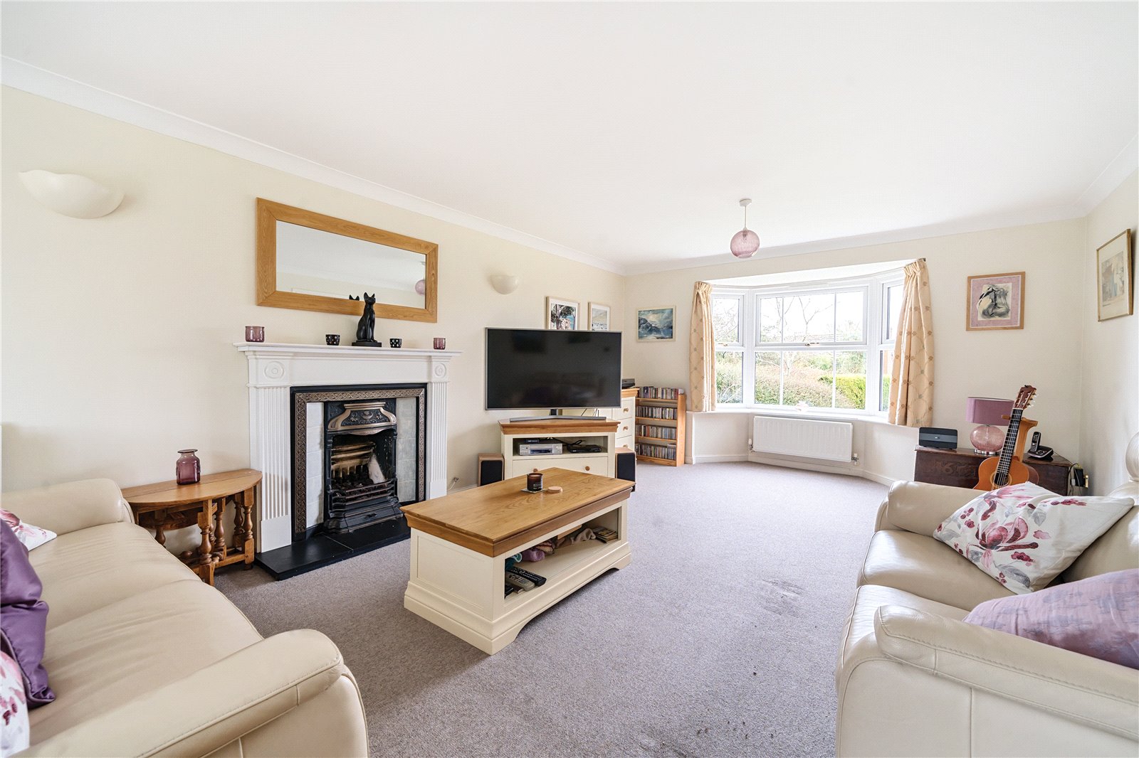 Sitting Room : Large dual aspect formal reception room featuring a large bay at the front with some glimpse views through to fields beyond. Coal effect gas fire with surround, 2 radiators , 2 light points, television and telephone points. Double doors to Conservatory.