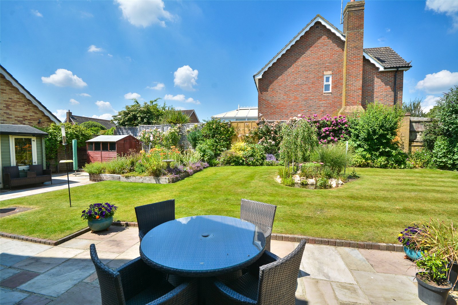 To the front is a path by the garage with a gate leading through to the rear. The rear garden boasts a wonderful stone terrace which extends across the width of the property with seating areas. There is a good sized lawn bordering the terrace with a central bed with ornamental pond and well stocked flower beds framed by wall and fencing ensuring colour and screening.. To the rear corner there is a raised vegetable bed and a garden store.