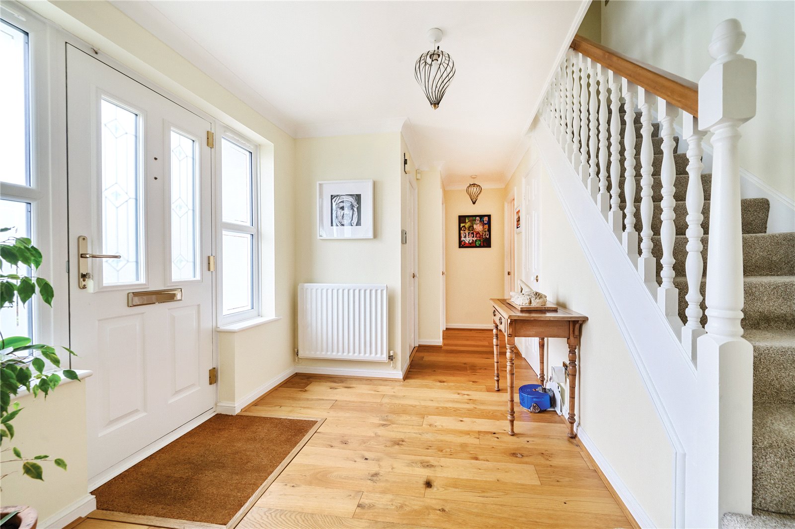 Reception Hall : Oak flooring with stairs to first floor with understairs storage, radiator and 2 light points.