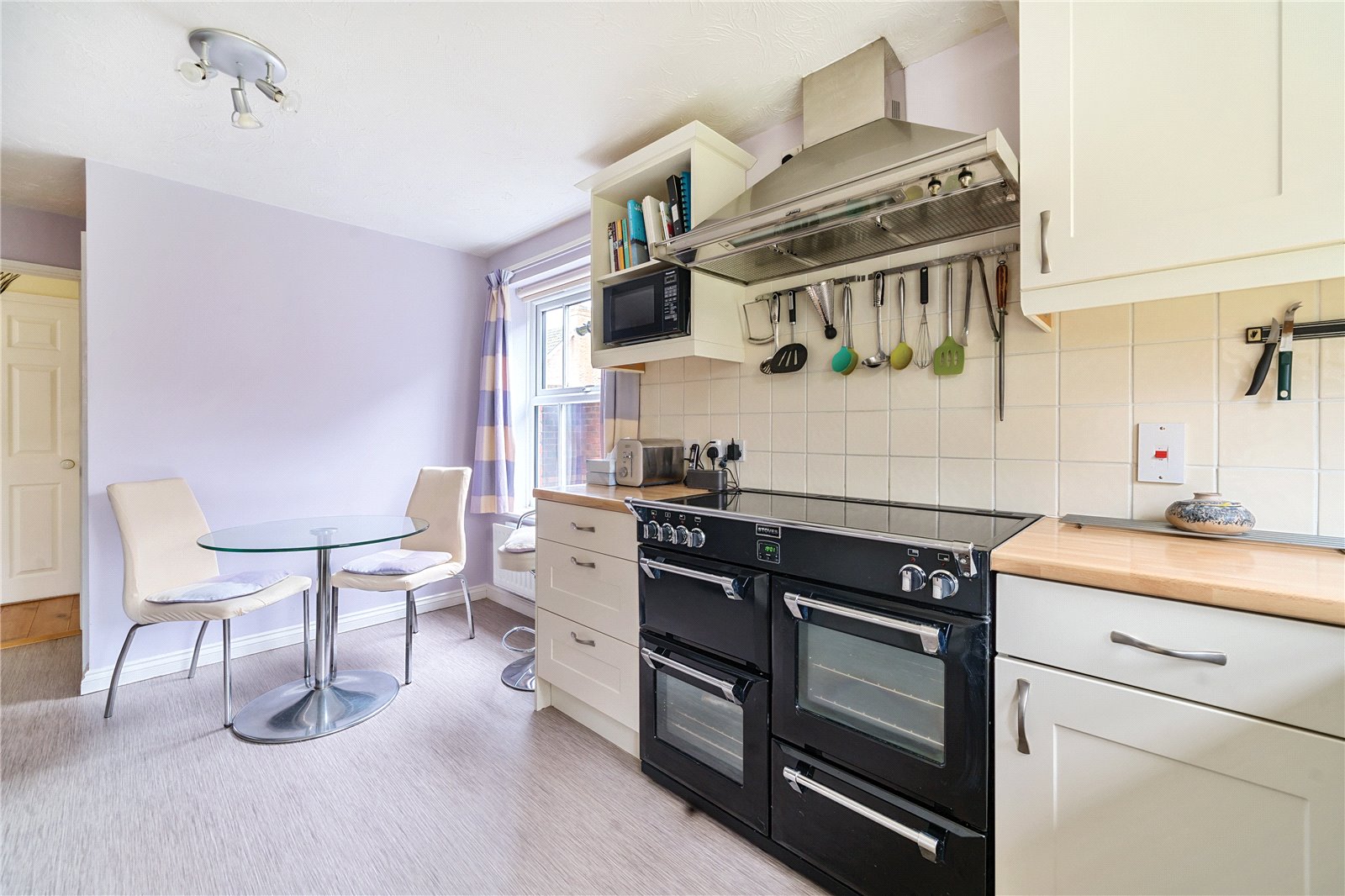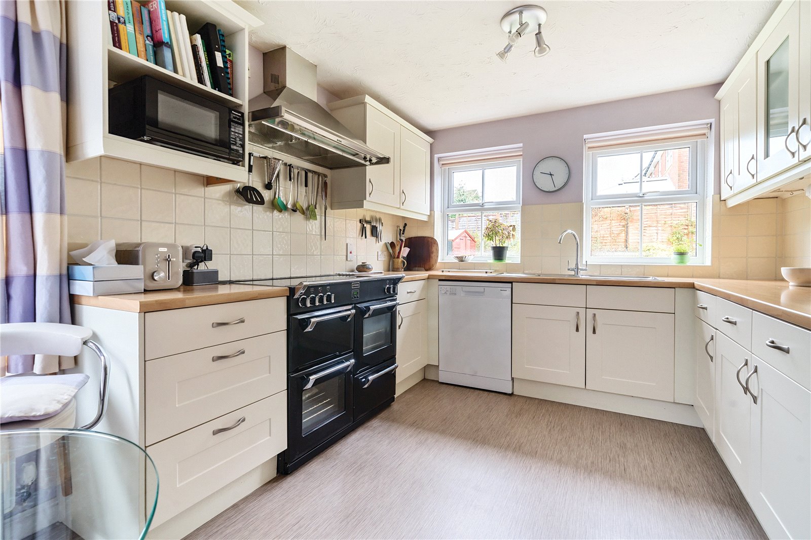 Kitchen/Breakfast Room : Attractively fitted with a range of Shaker style units comprising matching wall and base cupboards with spaces for fridge freezer, space for range cooker and space for dishwasher. Good range of cupboards with drawers and a carousel unit, open bookshelf and pull out rack. Range of work tops with stainless steel double bowl sink, cooker hood, part tiled walls, radiator and space for table. Dual aspect with view to the garden.