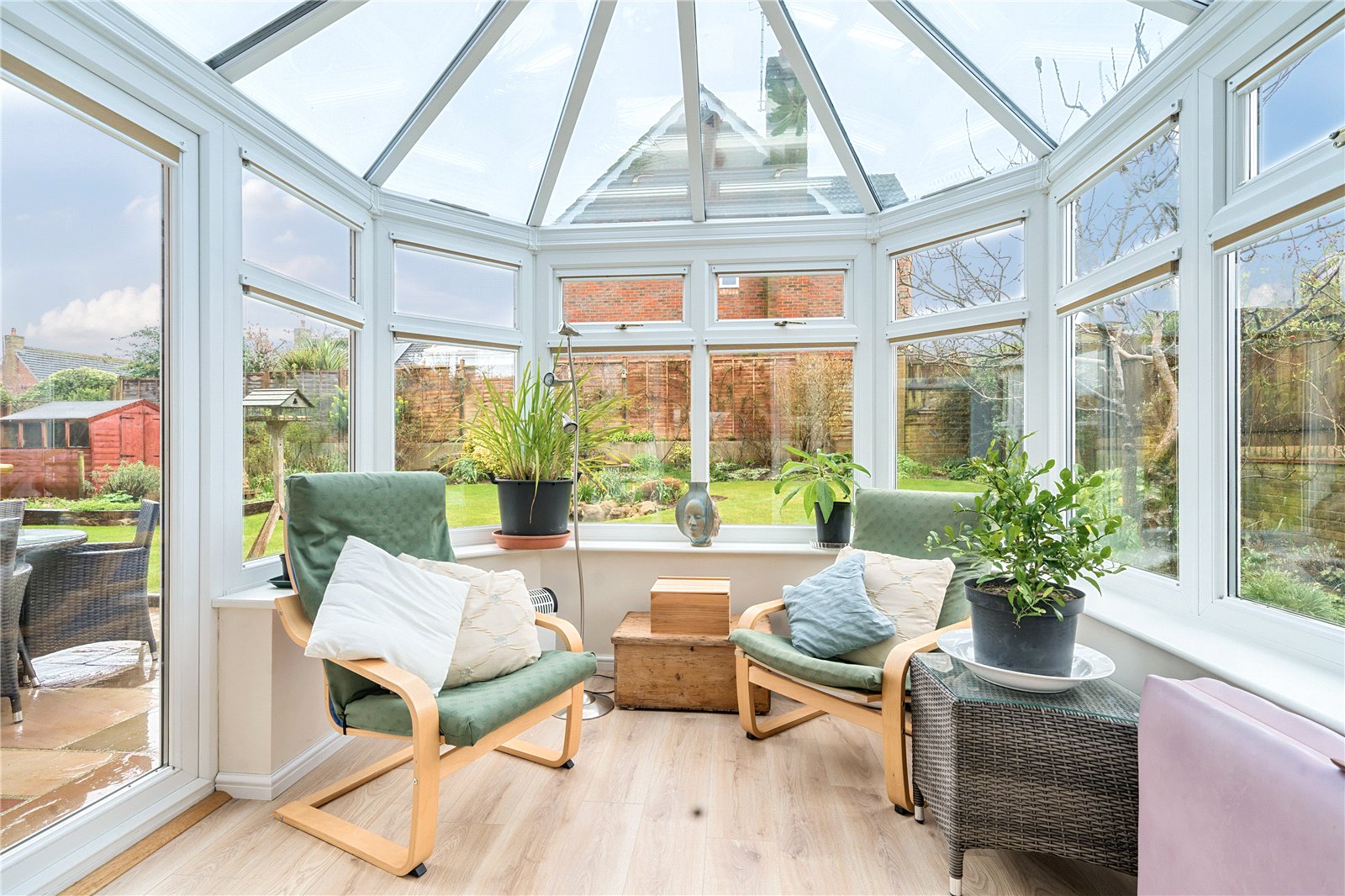 Conservatory : Picture windows overlooking the landscaped garden. Wood effect flooring, doors to the stone terrace and garden, power points.
