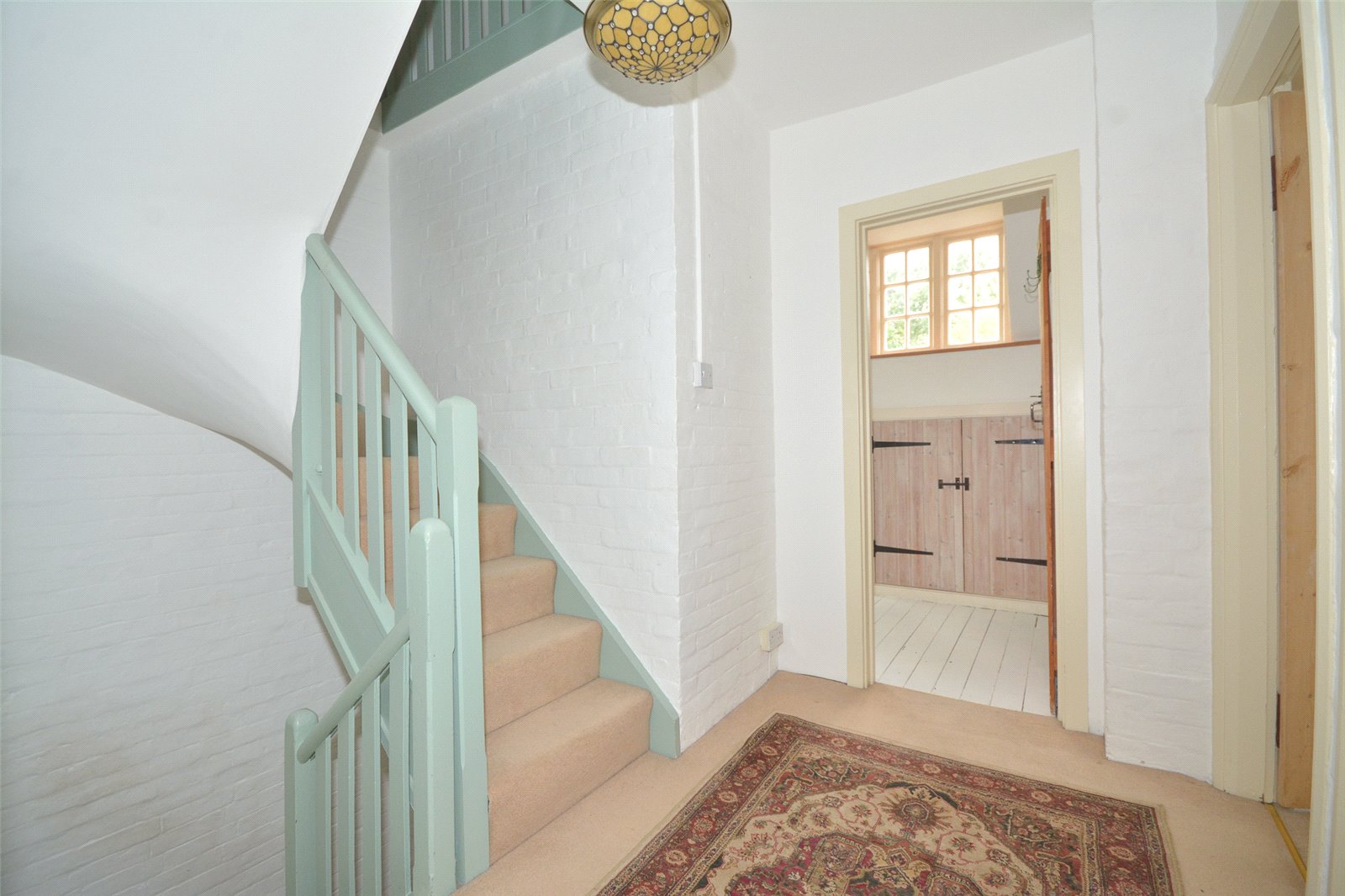 Reception Hall : Glazed brick floor with radiator and turned stairs with storage under.