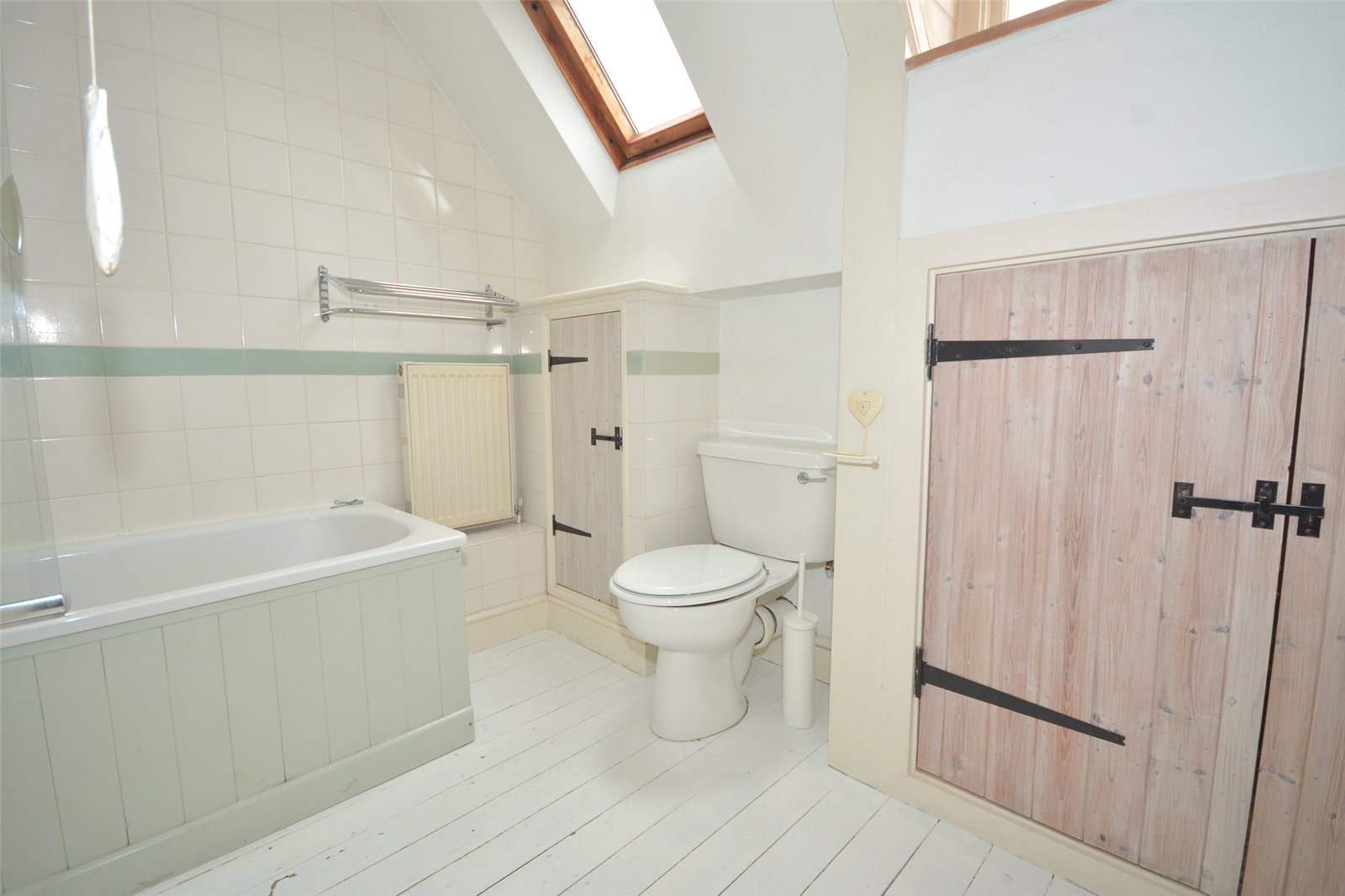 Bathroom : Family bathroom comprising suite of panelled bath with shower screen, WC and wash hand basin. Radiator, airing cupboard with immersion heater and shelved storage cupboard, part tiled walls, and wood flooring.