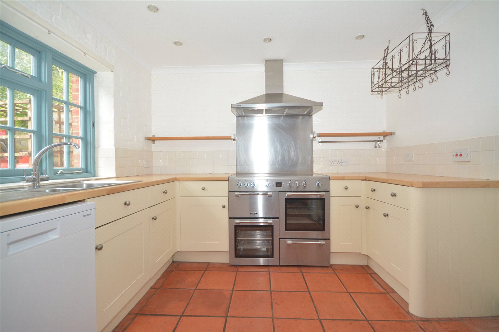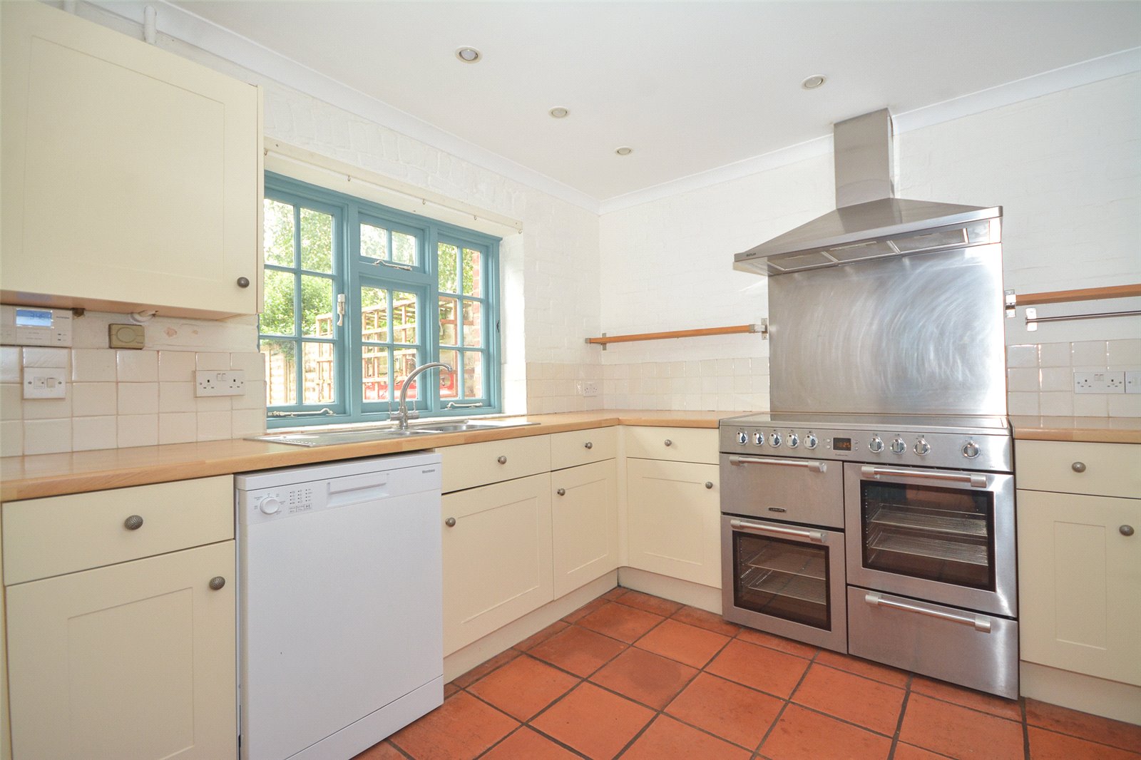 Kitchen : Attractively fitted with a range of Shaker style units in a cream finish and comprising base units with drawers. Range cooker with 5 ring ceramic hob with grill and double oven with stainless steel cooker hood and back plate, space for dishwasher and fridge/freezer, boiler cupboard housing Worcester gas fired boiler (propane) and a good range of worktops with 1 and ½ bowl sink unit. Views to the garden.
