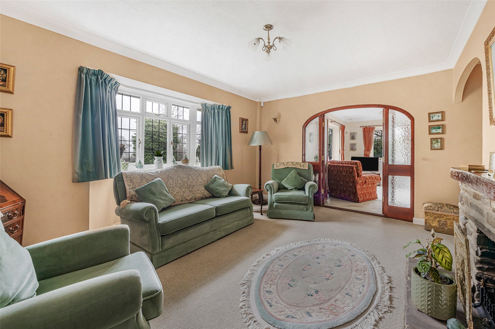 Sitting Room : Formal reception room with fireplace with surround and flagged hearth. Bay window with views over the front garden, wall light points, recess with stairs to first floor and arched opening with wood frame and doors to: