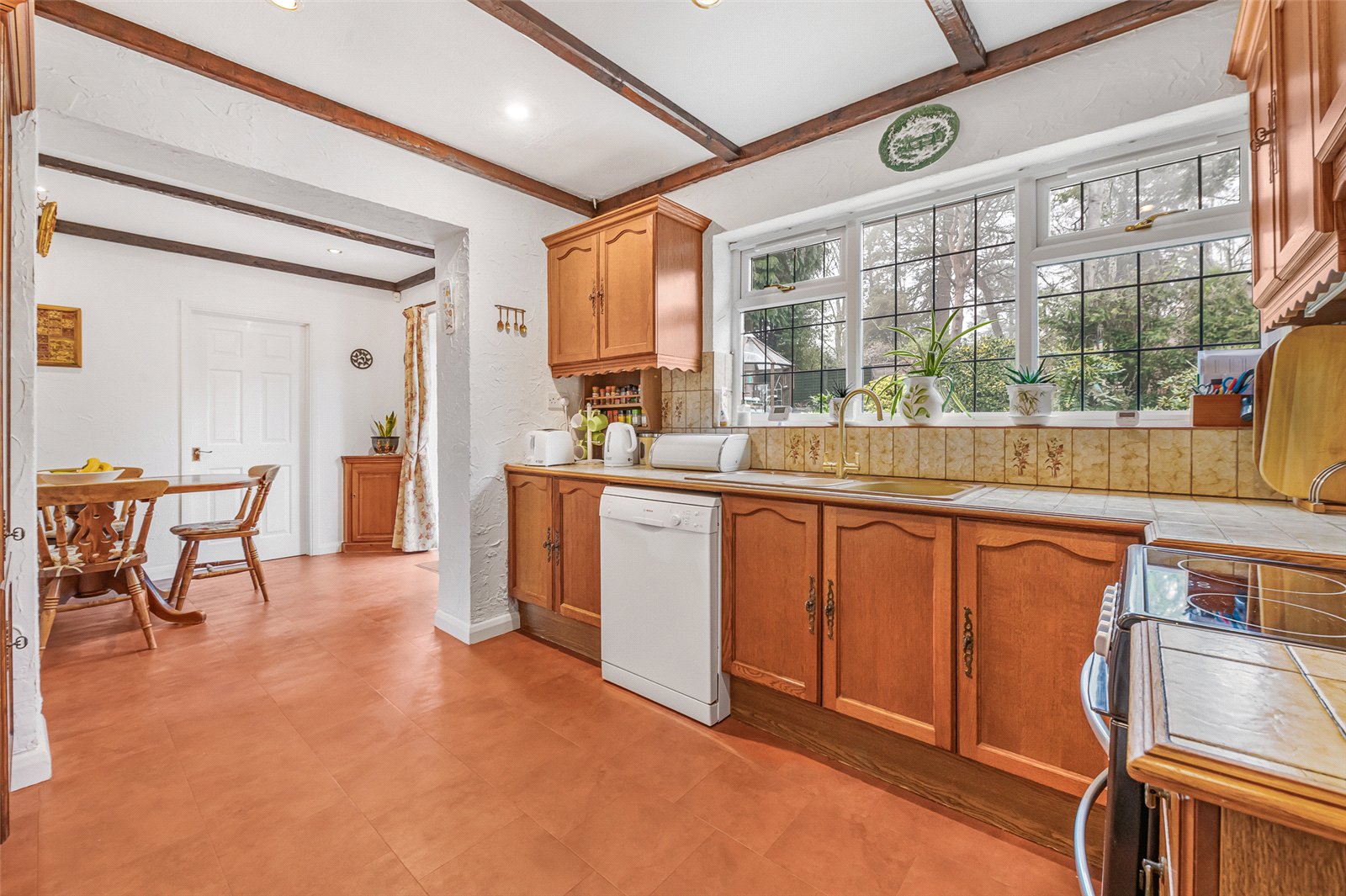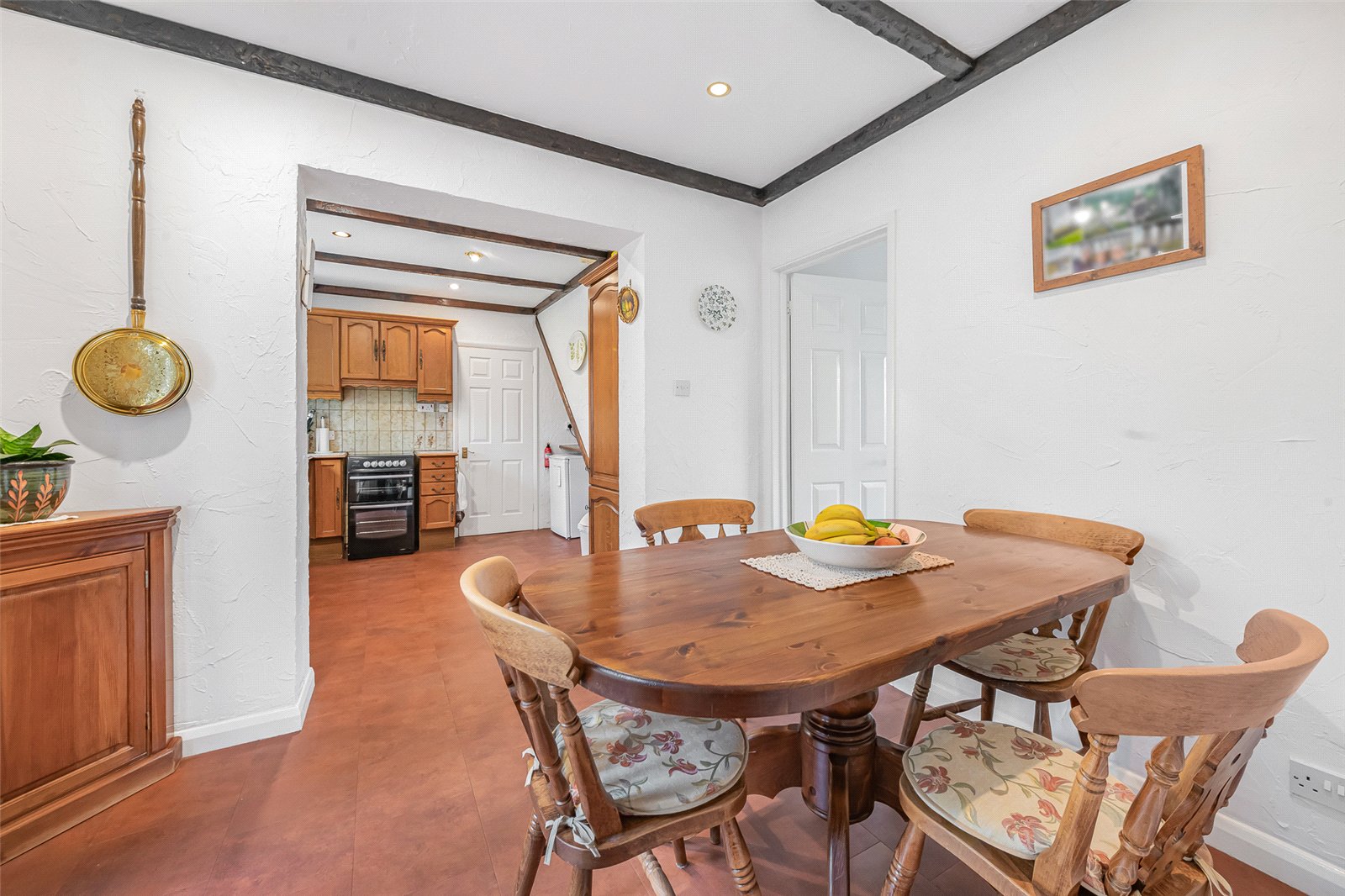 Open to Breakfast area with space for table and chairs with radiator and feature beams. Downlights and double doors to terrace and garden.