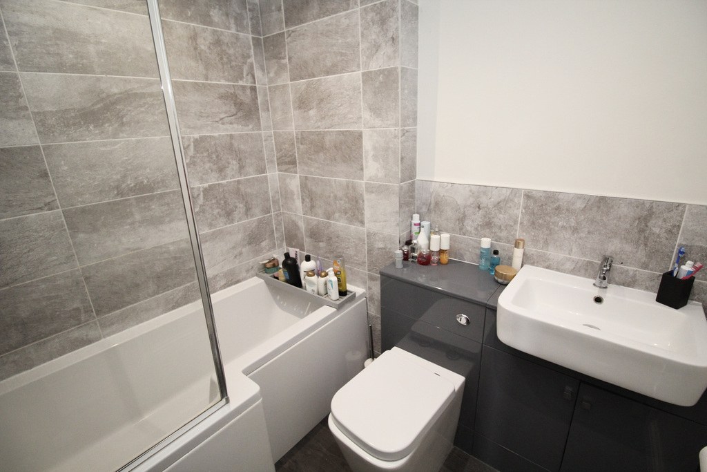 - Stylishly presented with tiled walls, a white suite including bath with shower over, WC, and wash hand basin set into modern vanity storage.