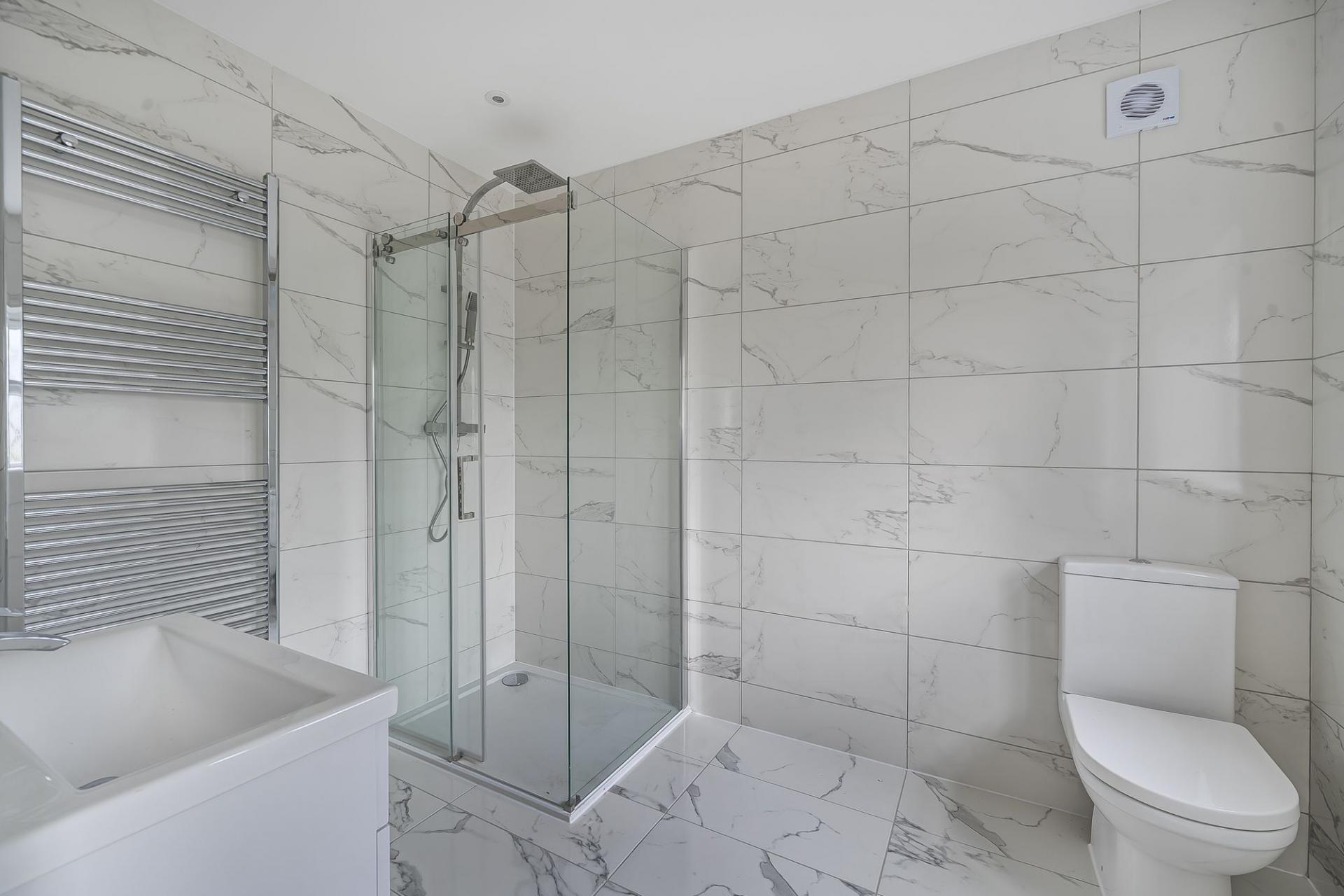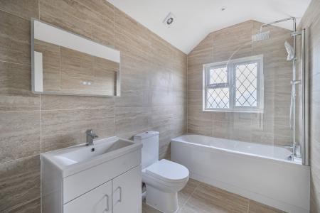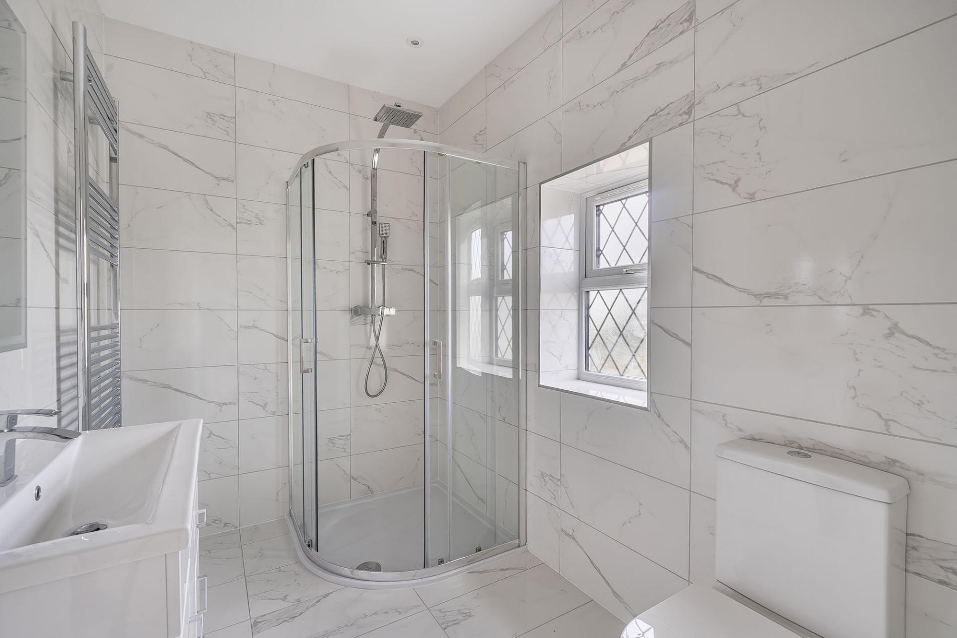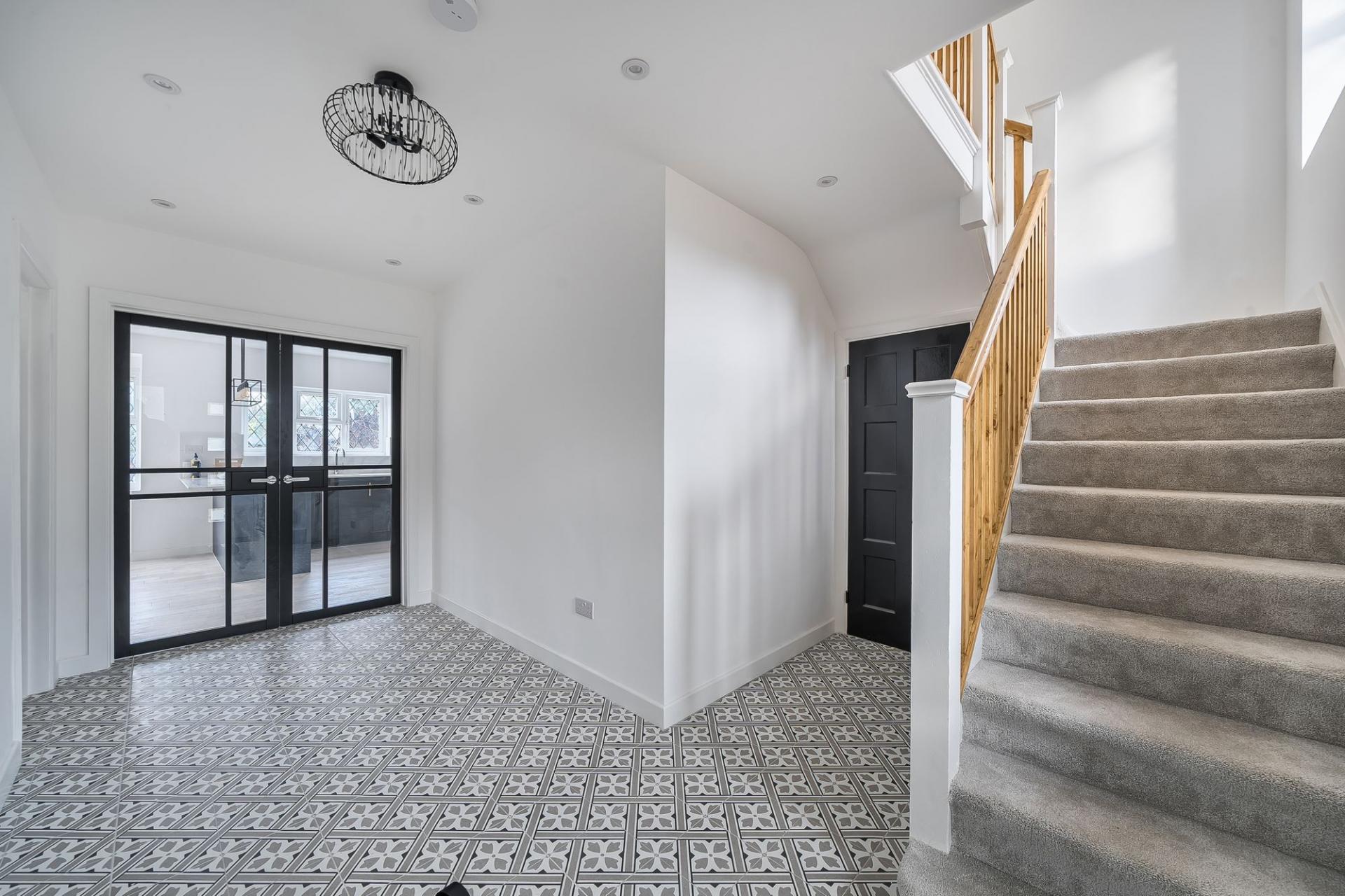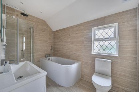 Upstairs, the first-floor landing leads to four double bedrooms, two of which enjoy modern en‑suite shower rooms, making them ideal for guests or older children seeking a little independence. The family bathroom is fitted with a contemporary suite and stylish tiling, completing this floor beautifully.