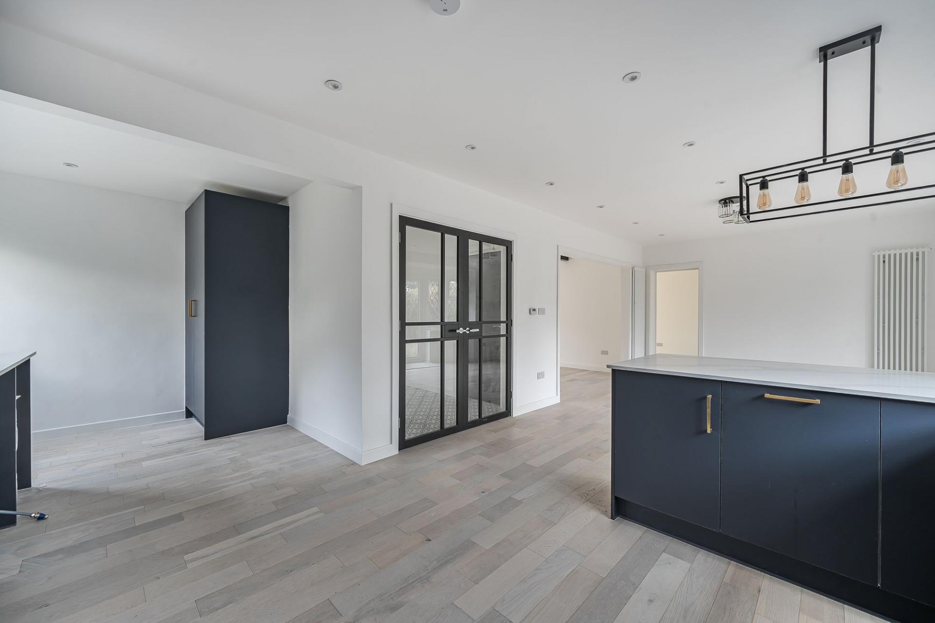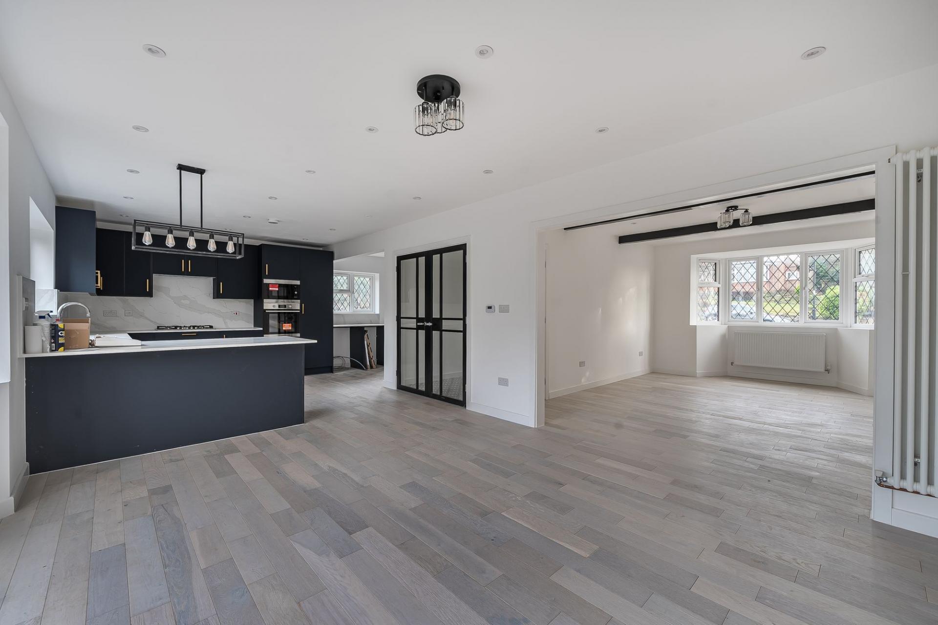 You are greeted by a bright entrance hall, setting the tone for the rest of the house with its spacious feel and high-quality presentation. Off the hall is a convenient downstairs WC, while double glass doors open through to the heart of the home — an impressive kitchen/family room. This inviting, sociable space includes a wide range of contemporary fitted units, sleek work surfaces, a built‑in oven and microwave, and an integrated dishwasher. Natural light floods in through the window overlooking the rear garden, and double doors open directly on a veranda with steps to the garden.