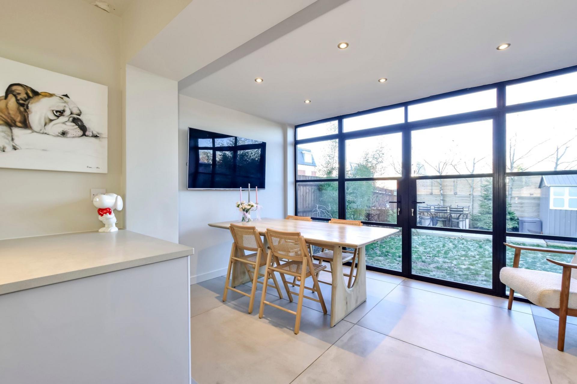 - Dining Room with Modern Floor to Ceiling Glass Doors Out