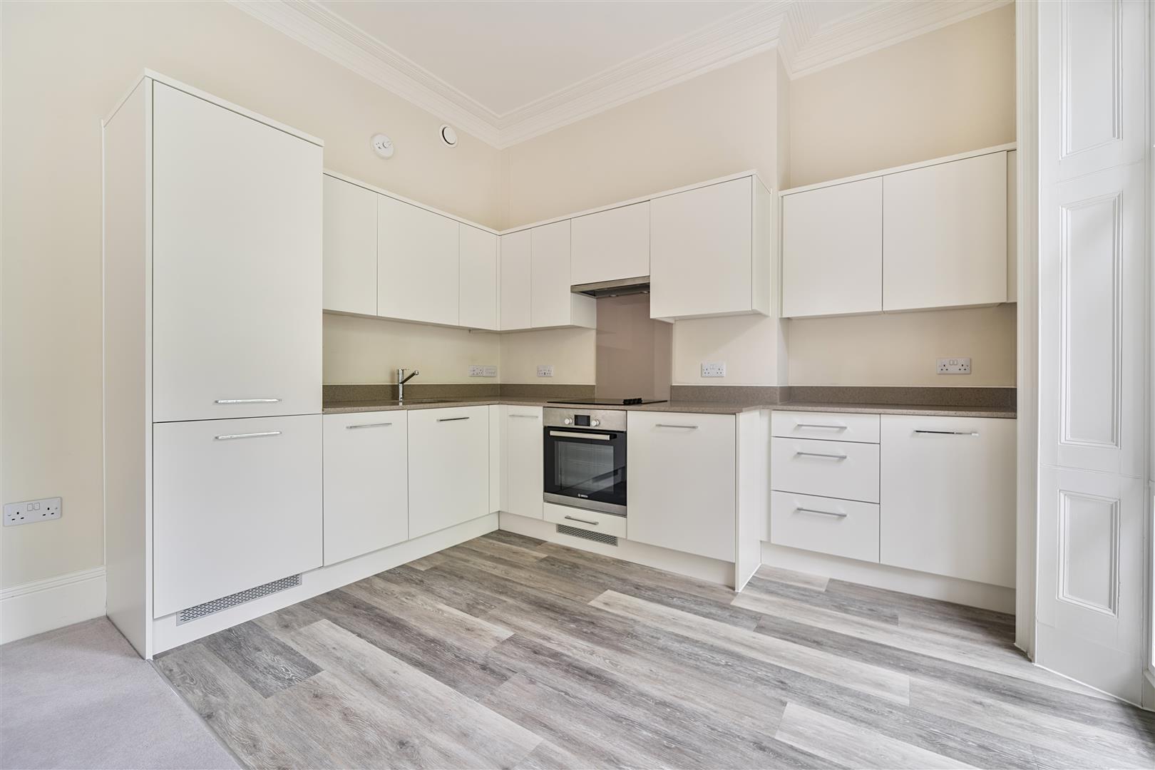 The well equipped and well finished kitchen benefits from laminate flooring and a large amount of natural light from the full height sash windows. White goods include fridge freezer, integrated dishwasher, four ring induction hob, built in oven and extractor as well as a washer drier.