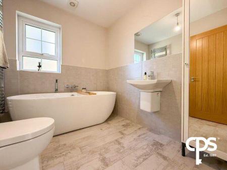 Fully tiled, with freestanding bath, wall-mounted radiator, floating sink unit, toilet, and separate 1m x 1m walk-in shower. Bright and modern family bathroom with high-quality fixtures.