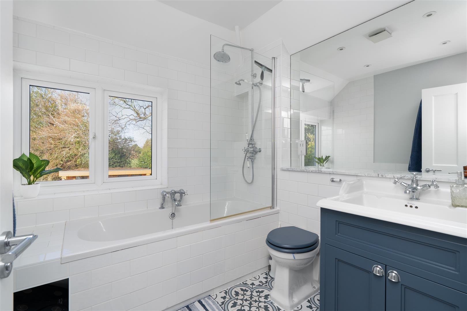 Bathrooms - Bathroom - bath with glass shower screen, wash hand basin in fitted cupboard, WC. Fully tiled wall and ceiling. Window to rear.