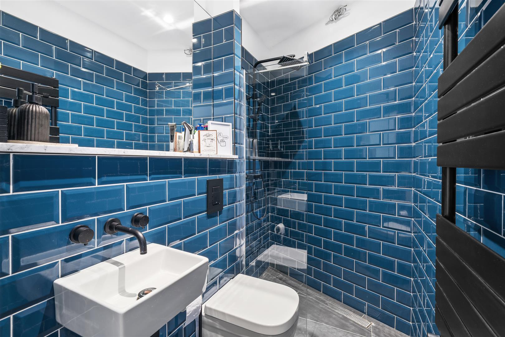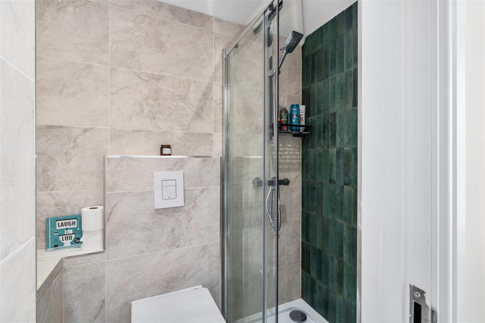 Downstairs shower room - fully tiled walls and flooring, WC, wash hand basin and walk-in shower. Heated towel rail.