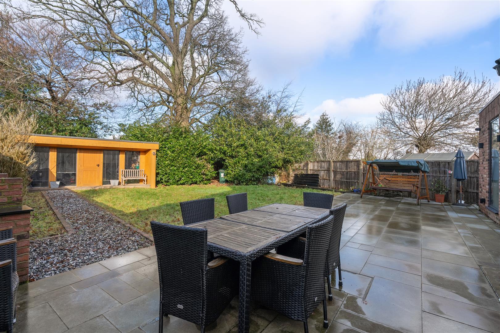 Outside - 23.14 x 10.99 (75'11" x 36'0") - Rear - paved patio area with gravel path leading to purpose-built insulated garden cabin (currently used as a gym). The patio opens onto a generous centre area of lawn with mature planted border beds and secure fenced boundaries. Pedestrian access at the side to front. Views over the park to the rear.