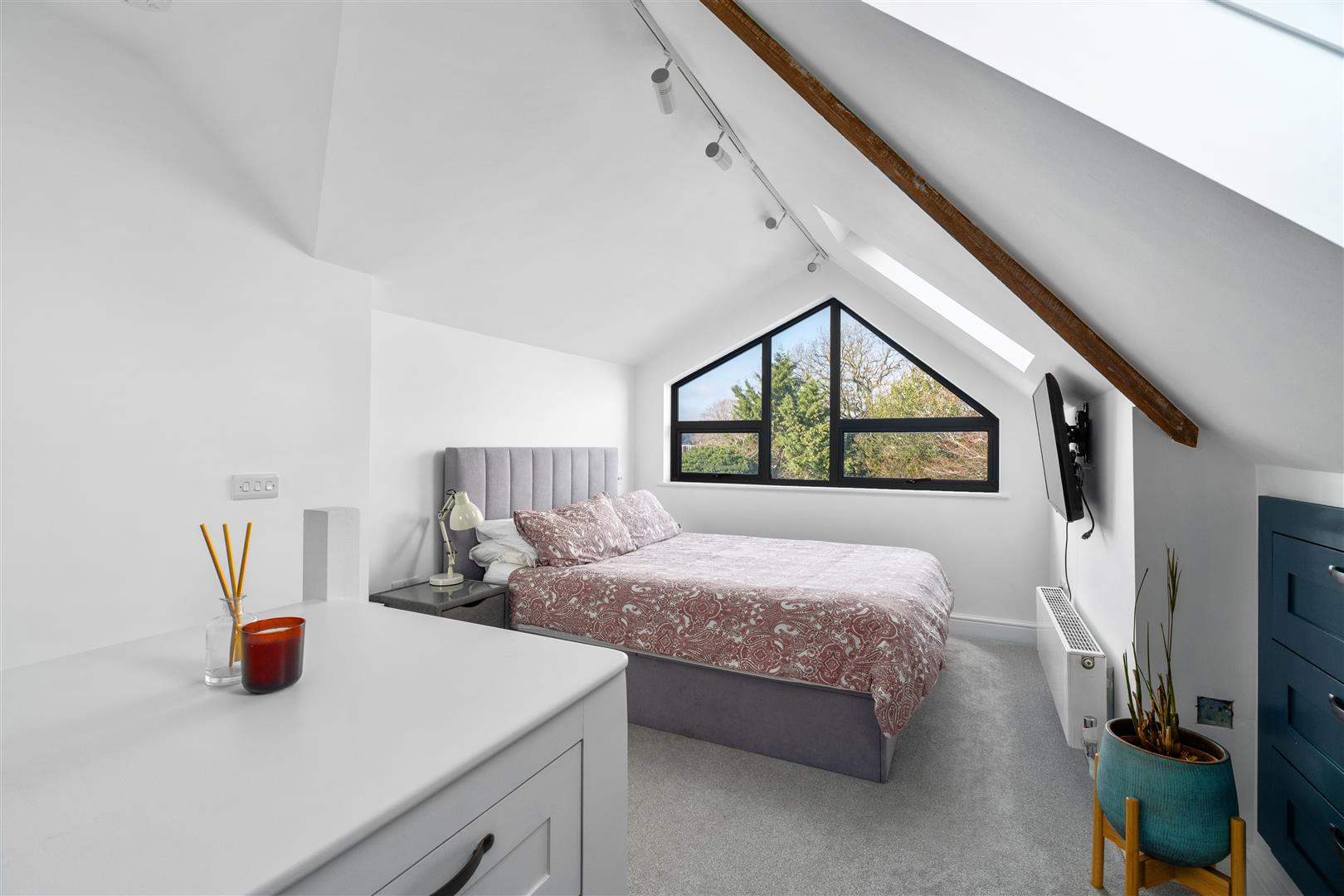 Bedrooms - Bed 1 - Loft suite - feature window, bespoke eves storage & shelving. Two velux windows