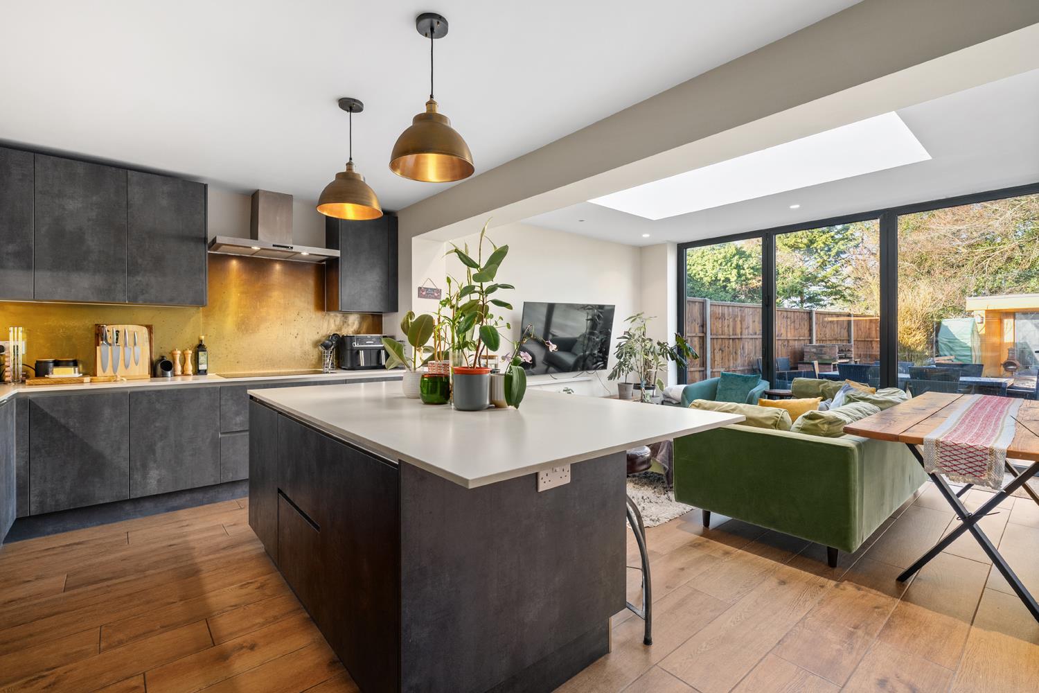 Kitchen/Diner/Family Room - The kitchen is fitted with a range of floor to ceiling wall and base unit is a matt grey finish with Silestone Desert Silver Quartz with Suede Finish worktops and brass backsplashes. Island unit with storage and seating. Inset stainless steel sink unit, halogen hob with extractor over. Eye level oven and microwave. Integrated appliances, to include a floor to ceiling fridge freezer & fridge, dishwasher and integrated bin. Wood flooring, under floor heating. Bi-fold doors to garden, roof light.