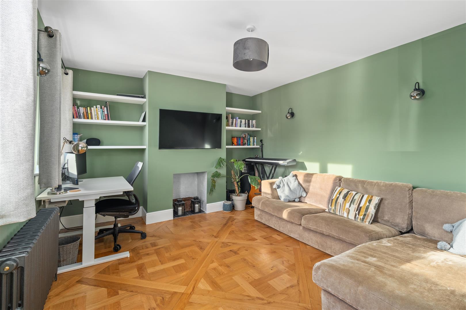 Lounge - Chimney breast feature, alcove shelving, parquet flooring. Window to front.