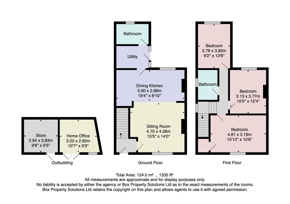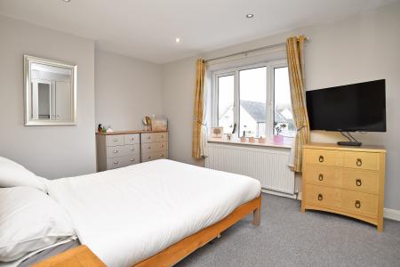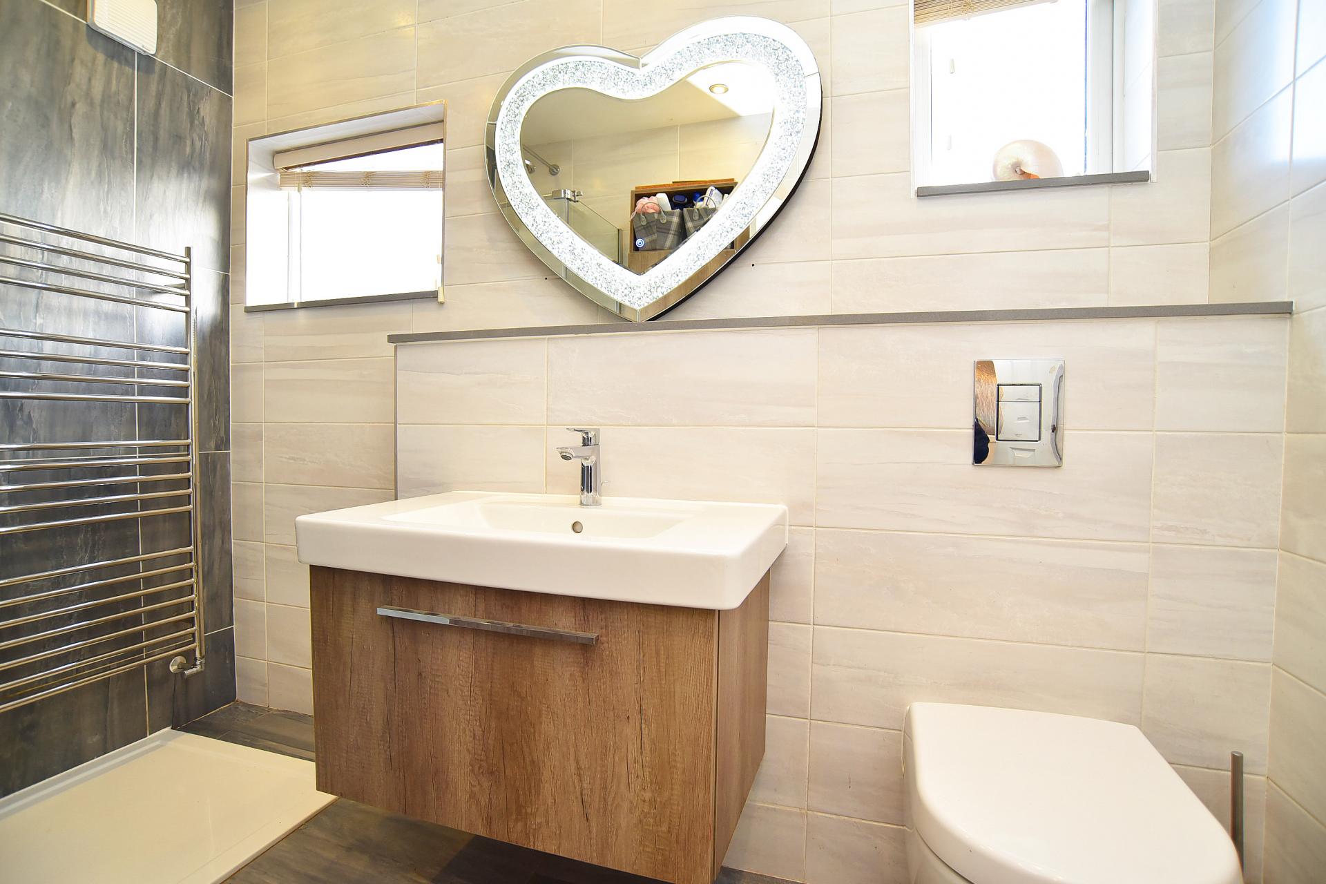 To the first floor are three well-proportioned bedrooms and a fully tiled house bathroom, featuring a bath, low-flush WC, and vanity unit with inset sink.