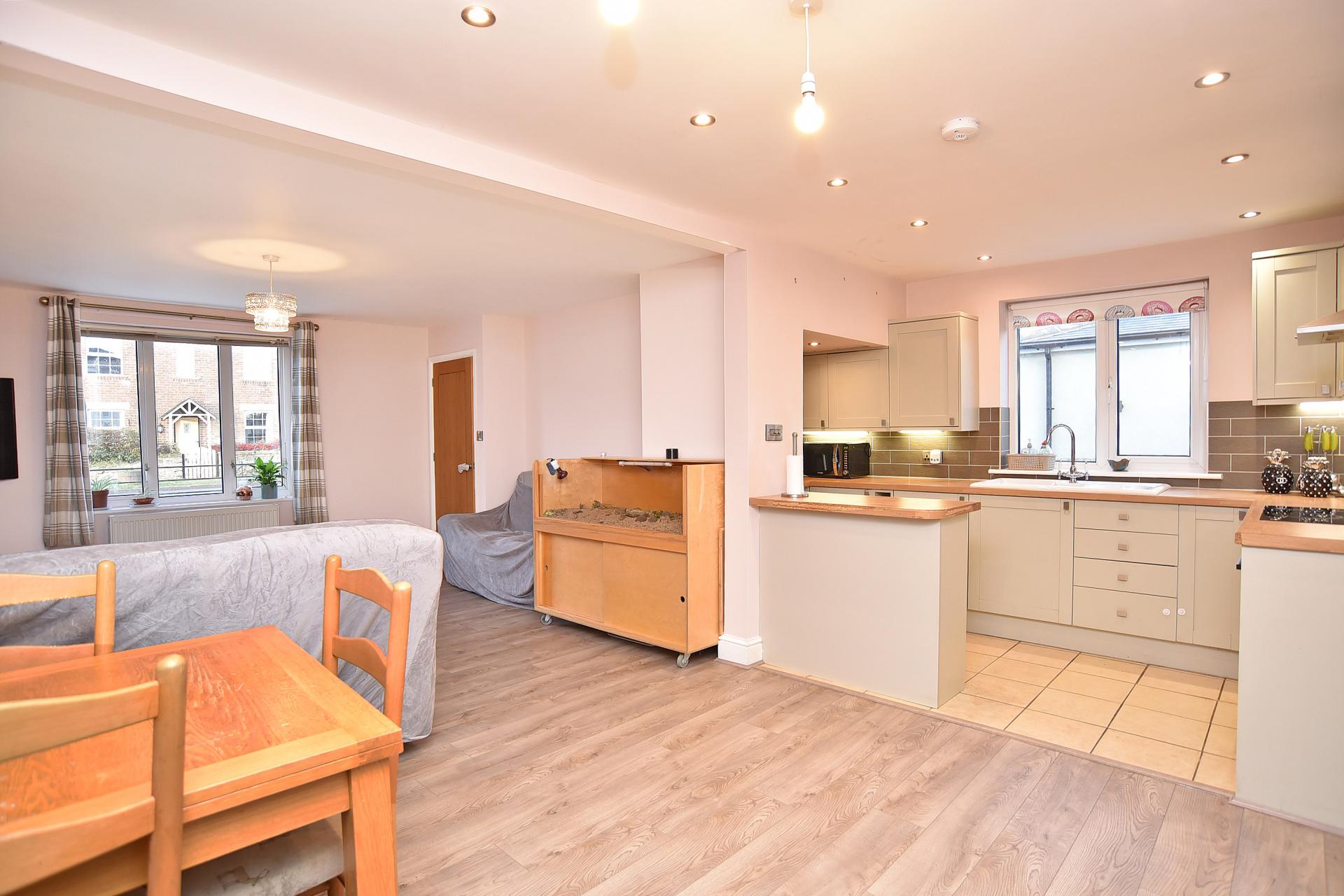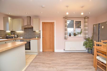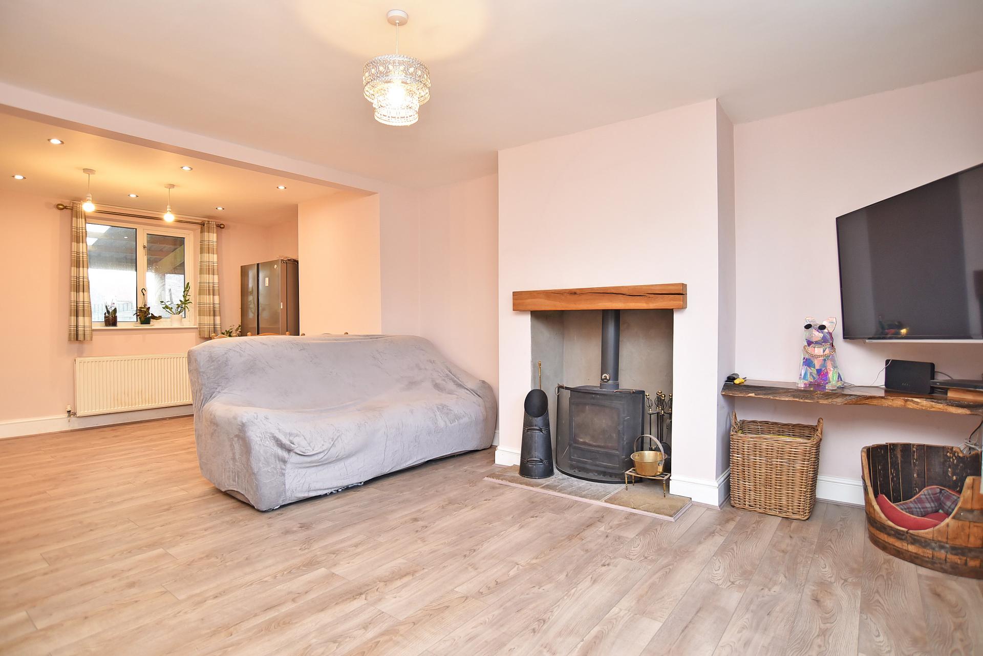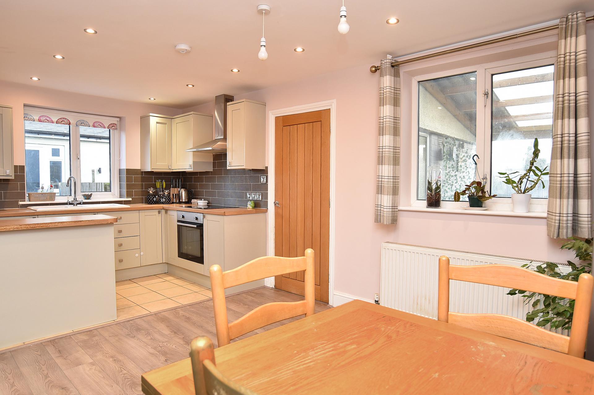 ACCOMMODATION This well-presented family home briefly comprises an entrance hall leading through to an impressive open-plan living and dining room with a multi-fuel burning stove and kitchen area. The kitchen is fitted with a range of wall and base units with complementary work surfaces, an inset ceramic sink, and a breakfast bar. Appliances include an electric oven and hob with extractor hood over. There is a separate utility room with side door access to a paved seating area with canopy, together with a ground-floor wet room and WC.