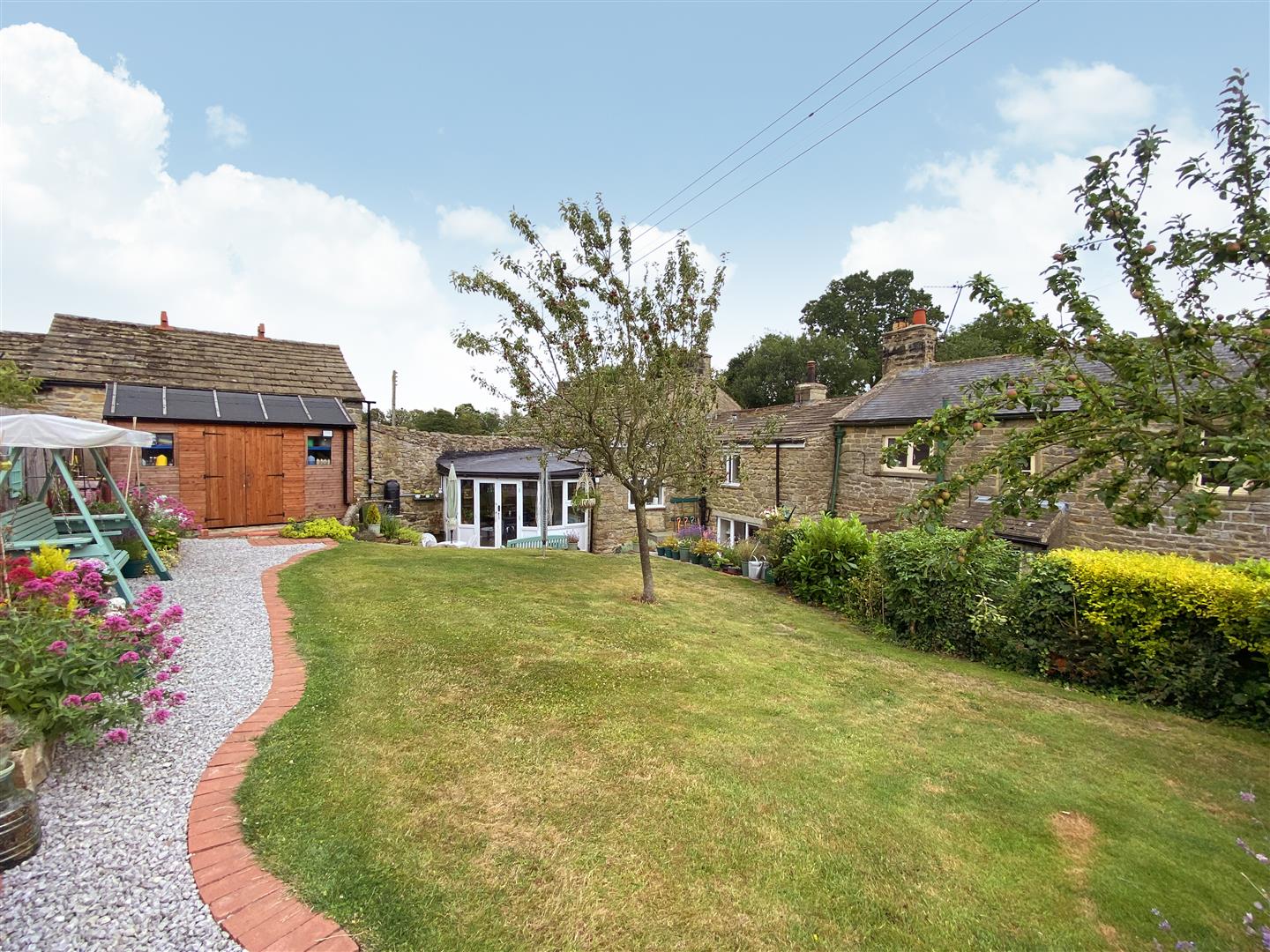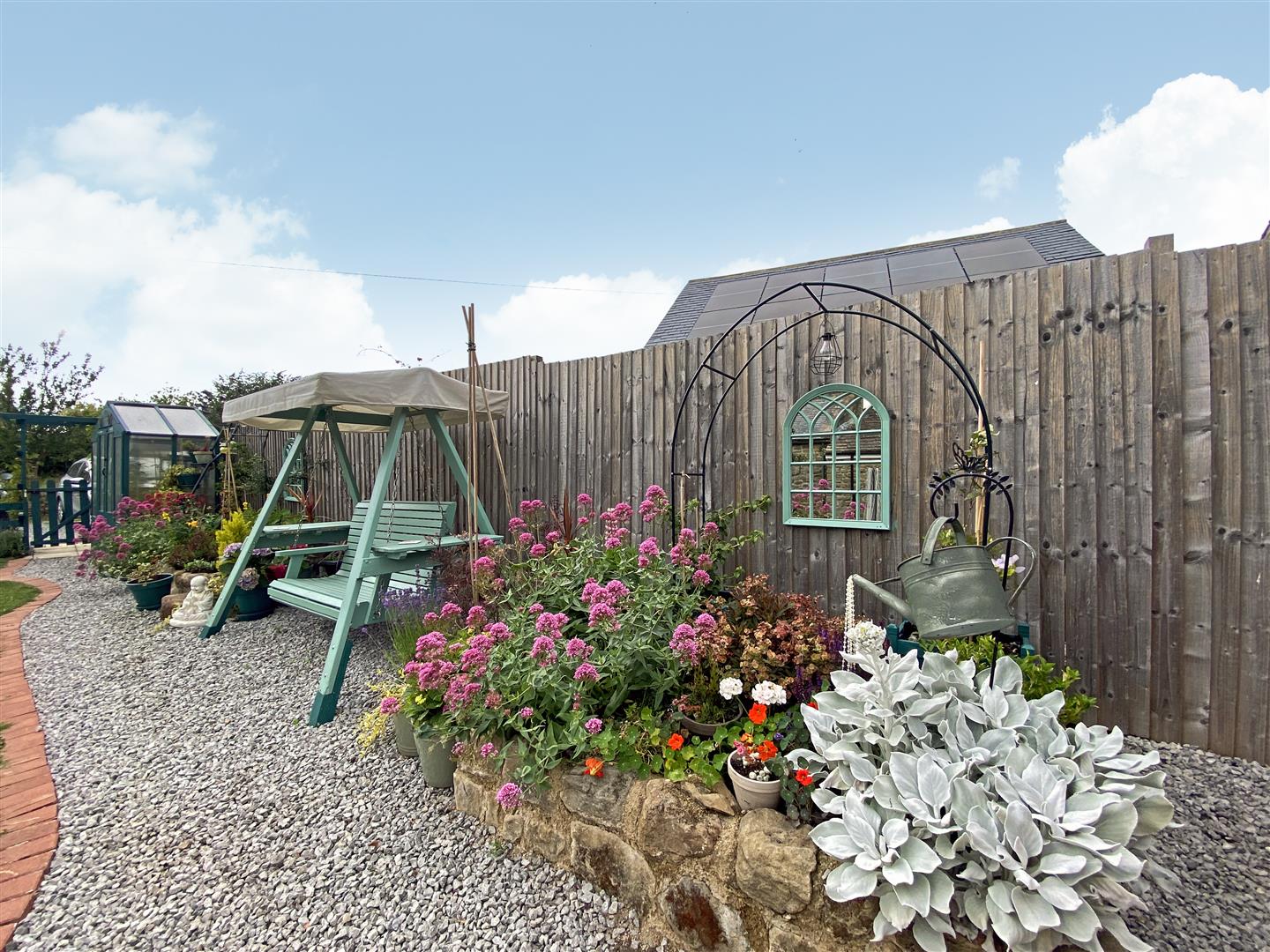 To the rear is a lovely lawned garden with a shrub border. From the sun room is a paved seating area with stone steps and retaining wall up to a gravelled path by the lawn, which has flower bed borders with stone edging and there is a useful shed for storage that has lighting and power points for those wanting a workshop. A gate leads through to a gravelled driveway which has parking for 2 cars accessed via a right of way from a lane to the side of the neighbouring property. There is also some veg beds and a greenhouse too.