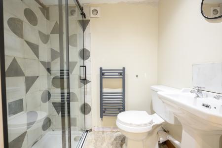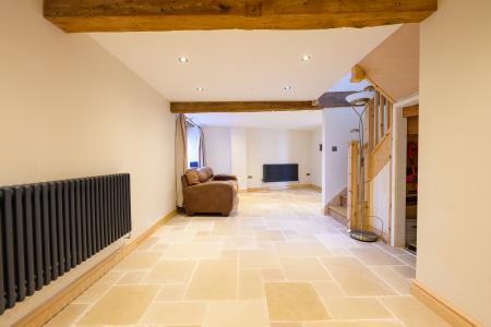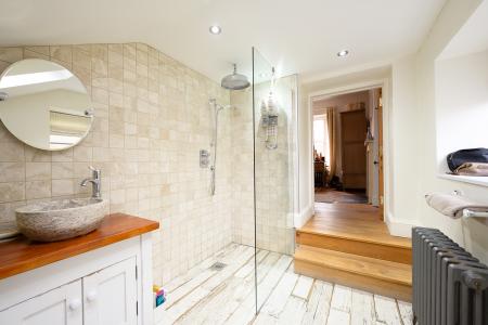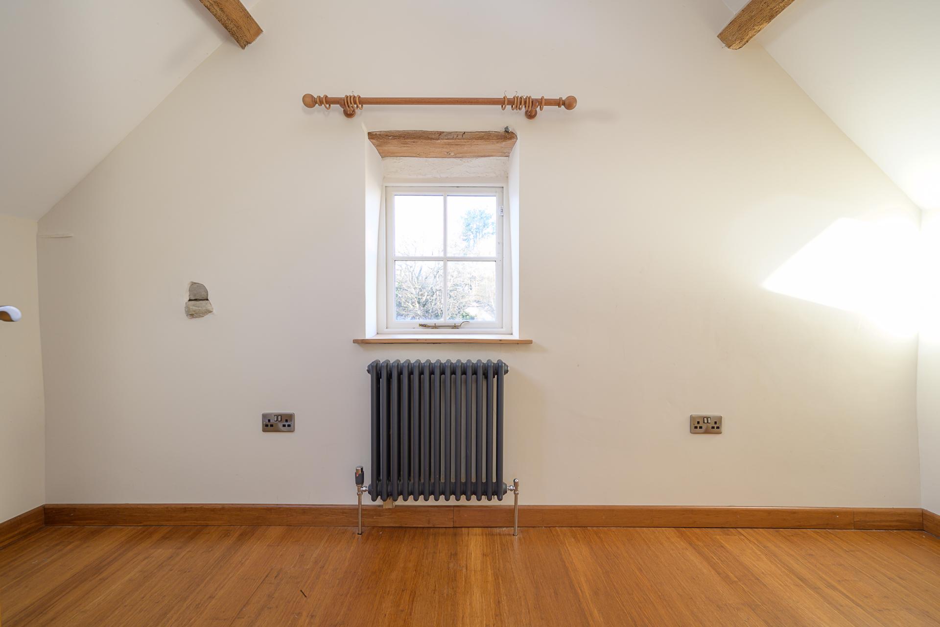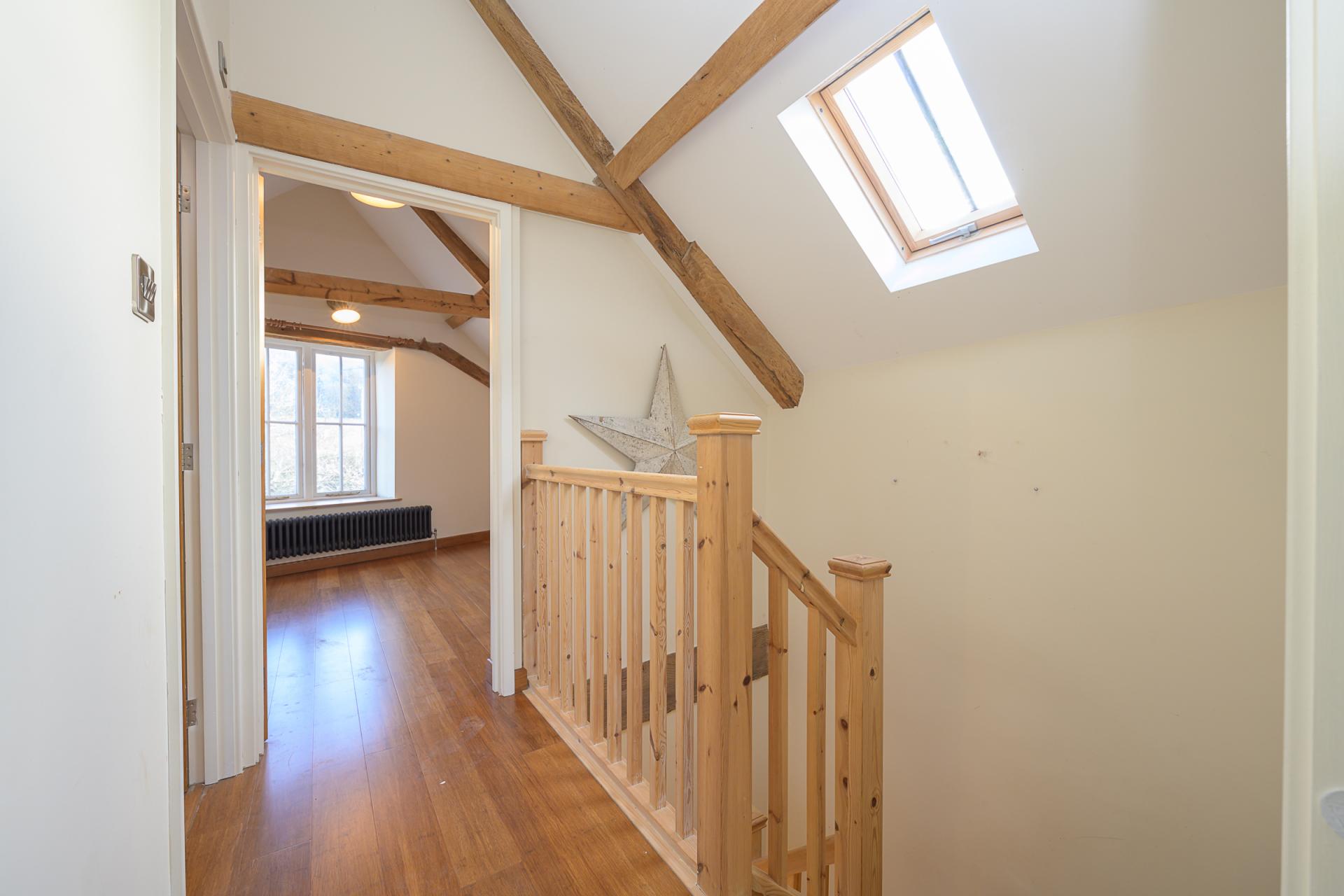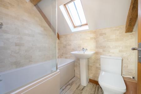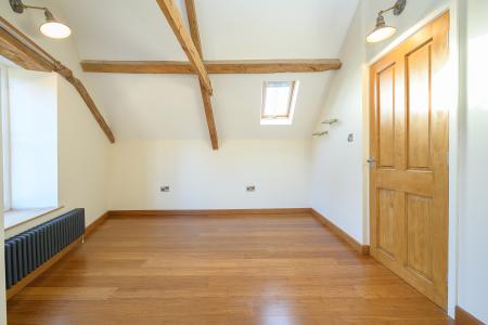 The top floor accommodates two bedrooms, both of which boast vaulted ceilings with exposed beams and trusses. In between the two rooms, there is a family bathroom, complete with a d-shaped bath with overhead shower, a WC, basin and a heated towel rail.