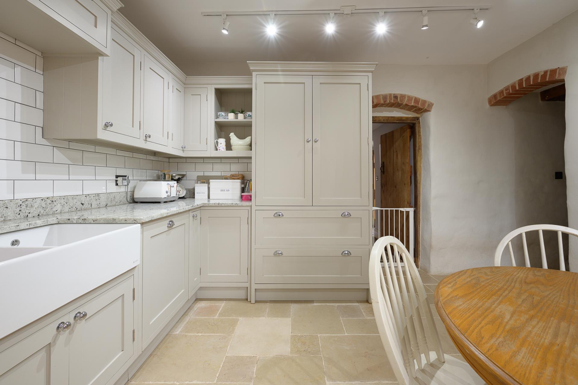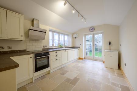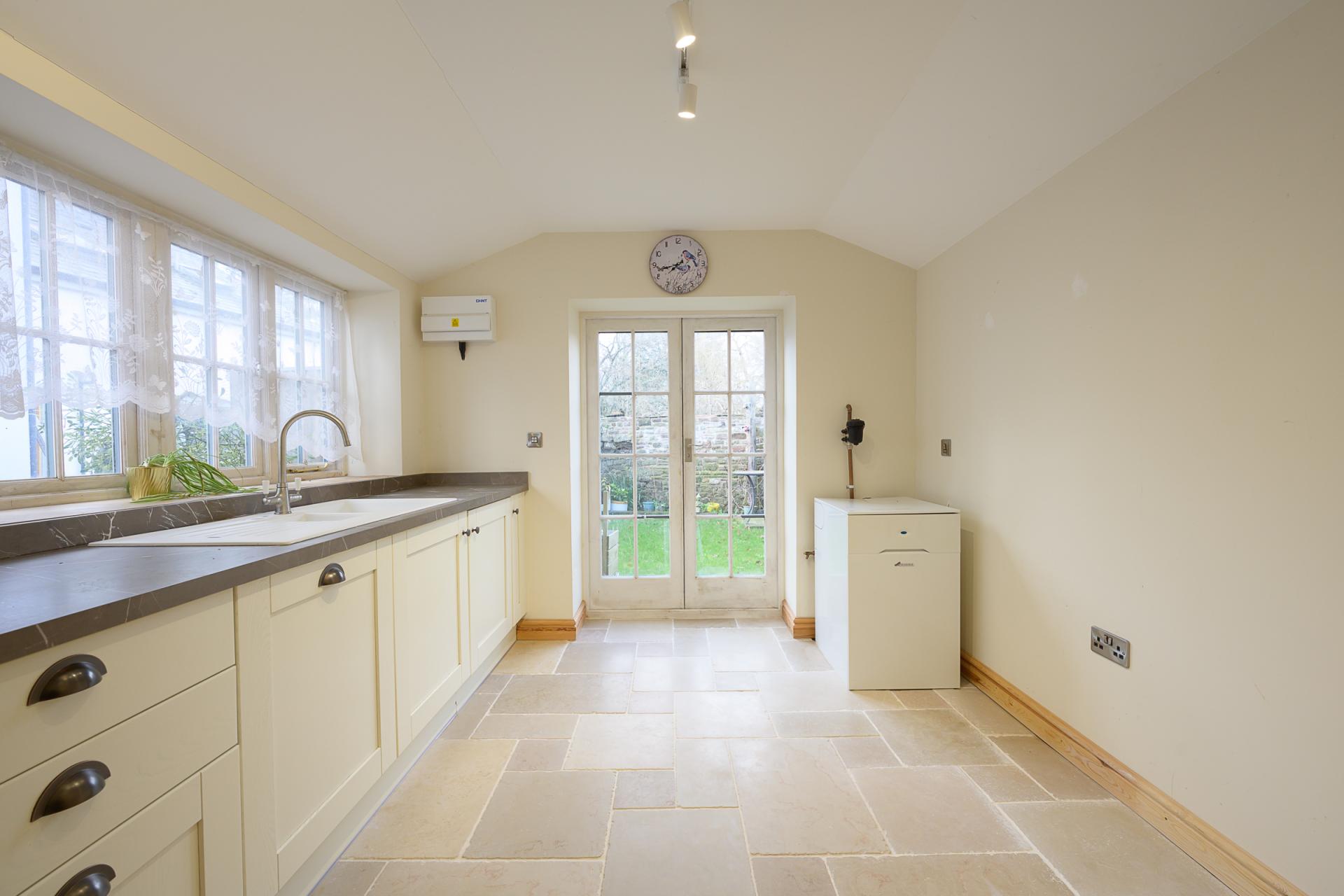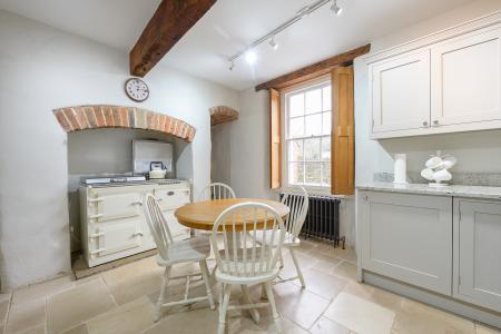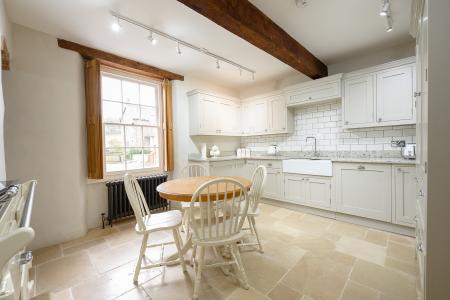 The handsome dining kitchen is tucked away on the far left-hand side of the reception hall. A tiled floor and shaker-style units - complete with marble worktops - a sash window with shutters, a Belfast sink and an Everhot range cooker all beautifully compliment the country house aesthetic, and the area is well-equipped with various integrated appliances such as a dishwasher, an under-counter fridge and a pull-out pantry. Two archways link the kitchen with a utility room, which contains additional shaker units with wooden worktops, another Belfast sink, and space for additional fridges or a freezer. There is also room and plumbing for both a washing machine and a tumble dryer and as the Worcester boiler is also housed within this area, this creates a warm space, offering a good opportunity to air-dry laundry.