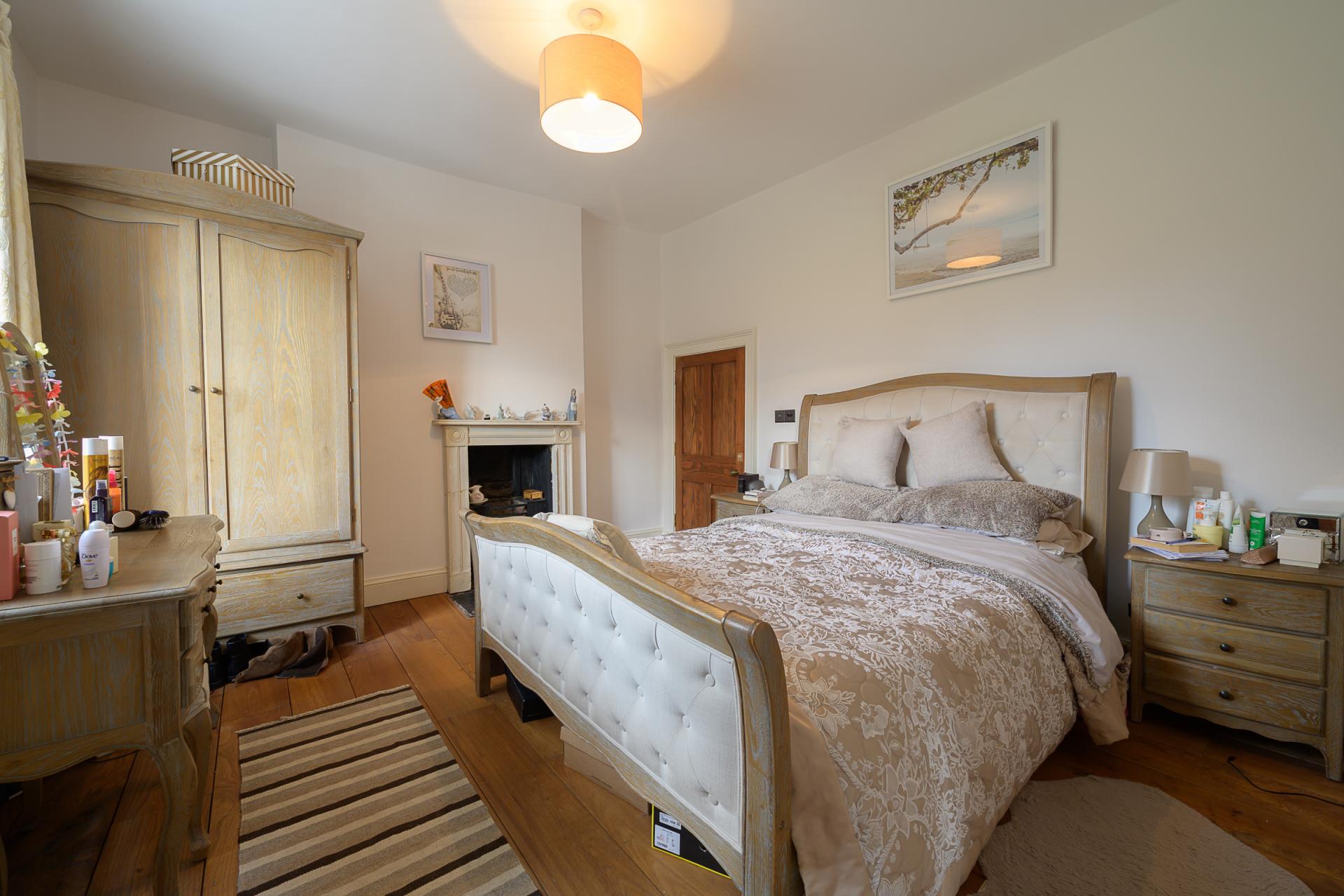 The other wing leads to a hallway. The first door opens into the gorgeous family bathroom. Plenty of natural light cascades into this space through three skylights. There is a freestanding clawfoot bath, a large walk-in dual-headed shower, a countertop vanity unit and a WC. Beyond the bathroom, a hallway wraps around to the rear of the home and gives access to two more double bedrooms, one of which is akin to the other double bedrooms as it includes a high ceiling, a cast iron fireplace and a sash window with shutters. The fourth bedroom carries a timbered, pitched ceiling and is beautifully bright as it is dual aspect.