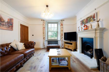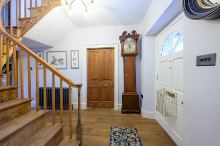 The front door leads into an elegant reception hall, which sets a splendid scene. An original curved wooden staircase wraps around to the top storey and there is a Victorian-style radiator - the first of many found throughout the home. A solid elm floor flows throughout the expanse into two reception rooms, which sit on opposite sides of the entrance. Of these the sitting room is the largest and this exquisite area boasts a high ceiling with picture rails, which accentuates the sense of spaciousness. A cast iron feature fireplace offers a pleasing focal point, as do ornate cornices and a sash window which is framed by wooden shutters. In the far corner, a set of glazed doors leads through into a sunroom, a bright and airy triple-aspect space which carries an exposed stone wall and a decorative tile floor. It overlooks the tranquil rear garden and includes a set of French doors leading to the grounds.
