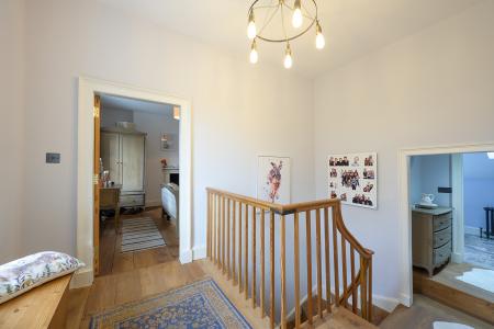 The first floor splits off into two wings. The right-hand fork leads to a small landing that gives access to two bedrooms, both of which exhibit high-ceilings, cast iron feature fireplaces and sash windows with original wooden shutters. Of these rooms, one also benefits from having an attractive light-streamed en-suite shower room which includes a large walk-in dual-headed shower, a countertop vanity unit and a WC.