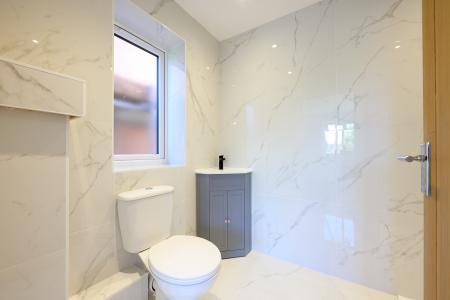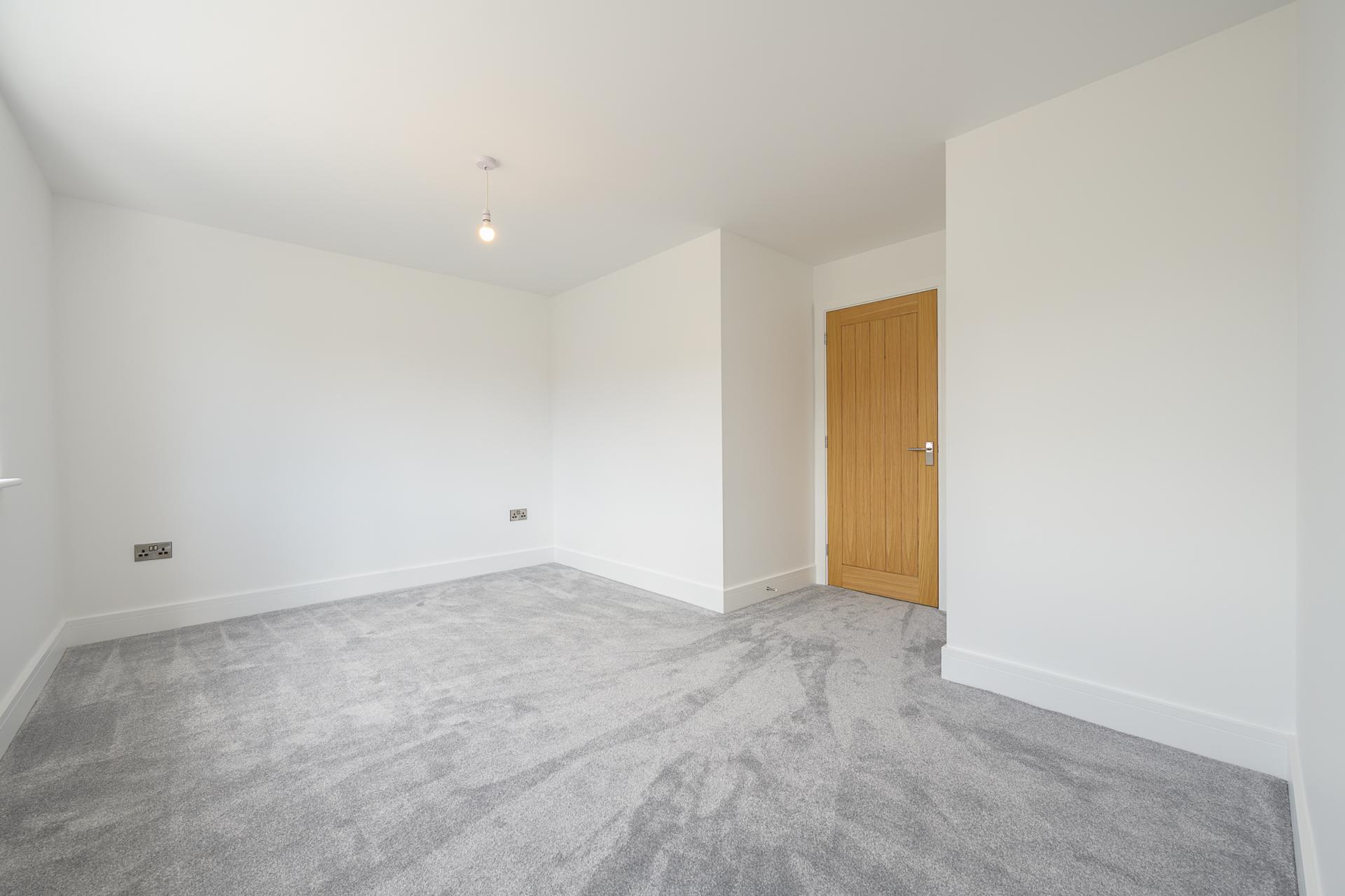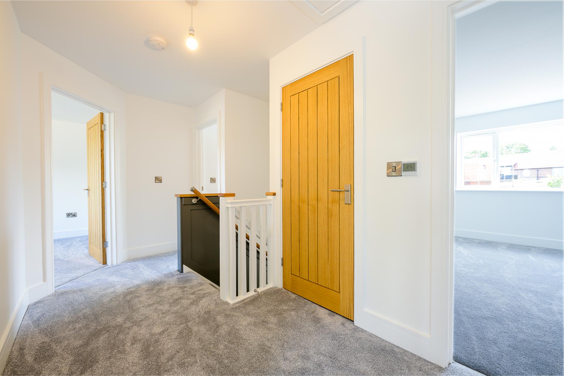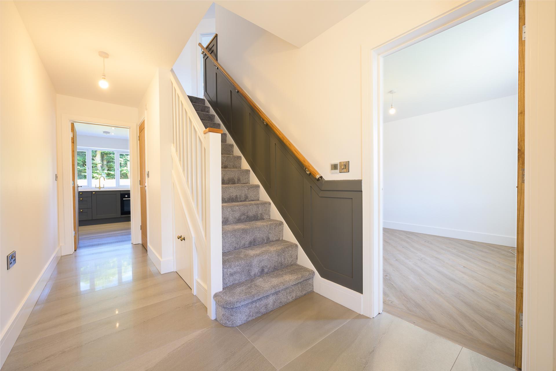 The ground floor also includes a cloakroom plus under-stair storage. The staircase within the reception hall is framed by on-trend half-height grey panelling, mirroring the shaker units in the kitchen. This leads to a landing which gives access to the four bedrooms.