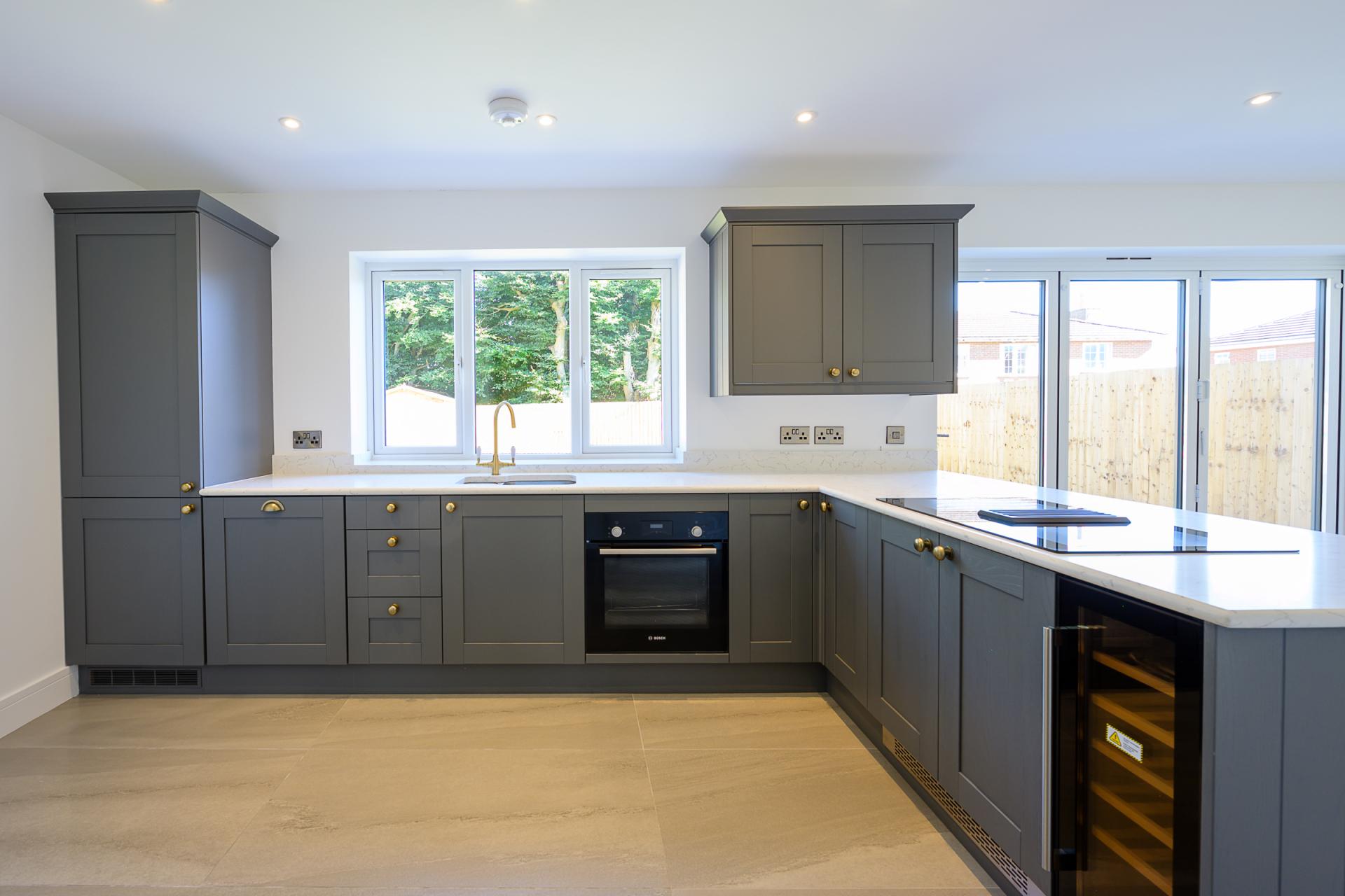 The main entrance into this immaculately-presented home is sheltered beneath a canopied porch and leads into a chic reception hall; an attractive tiled floor flows through into an open-plan dining kitchen - an elegant expanse which includes grey shaker-style units with muted gold handles and granite worktops. A breakfast bar acts as a natural divide between the cooking and dining zones and, within this, there is an induction hob with a built-in extractor, ensuring that no natural light is lost. The kitchen also features a deep sink with a muted gold mixer tap and a variety of integrated appliances, including a Bosch fan oven, a wine cooler, an AEG dishwasher and a Zanussi fridge/freezer. A set of bifold doors lead out to the low-maintenance rear garden which features an Indian sandstone patio, a level lawn and a shed in the far corner. The kitchen also gives access to a utility room, which has matching shaker units and worktops, additional storage and another sink with a mixer tap, plus a Hotpoint washing machine and a Hotpoint tumble dryer.