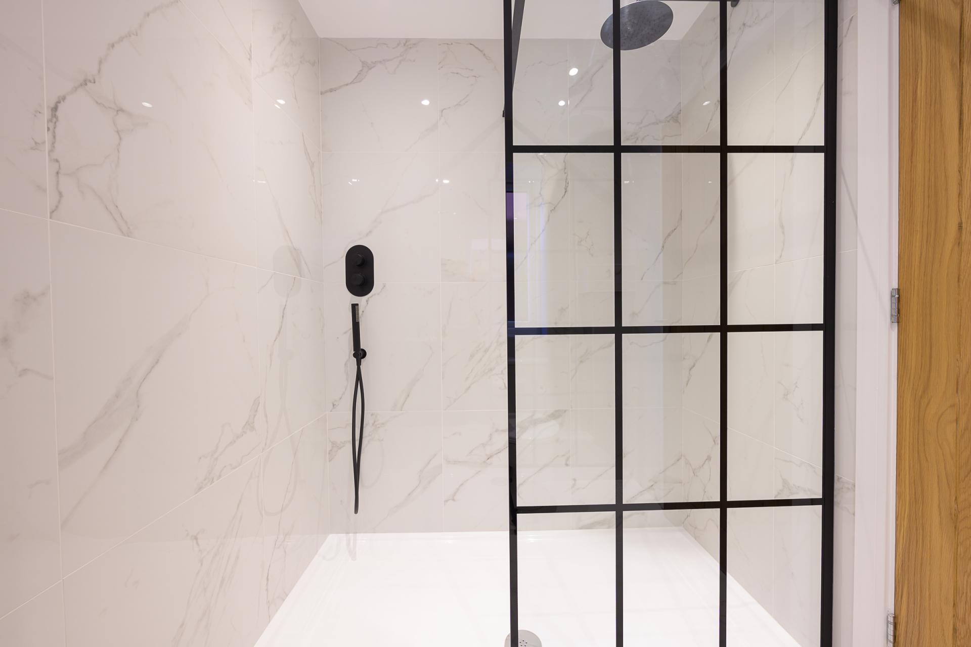The master suite overlooks the rear garden and contains a dressing room, complete with plenty of built-in shelving and hanging space. There is also a fully-tiled en-suite shower room, consisting of a walk-in shower with both drench and handheld showers, plus a corner basin and a WC. Of the other three bedrooms, all are large enough to accommodate double beds and one of these also offers a built-in wardrobe. The fully-tiled family bathroom includes a bath with shower overhead, a countertop vanity unit and a WC.