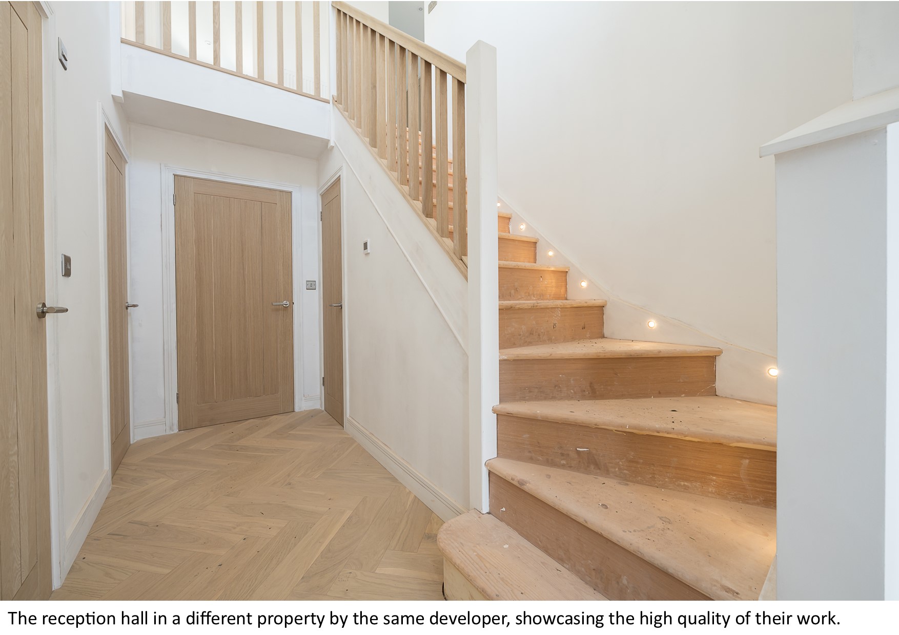 The main entrance - a secure composite front door - opens into an impressive reception hall. A calming, neutral colour palette sets a restful tone, beautifully complemented by solid oak doors and a herringbone oak floor that flows seamlessly into the open-plan living space beyond.