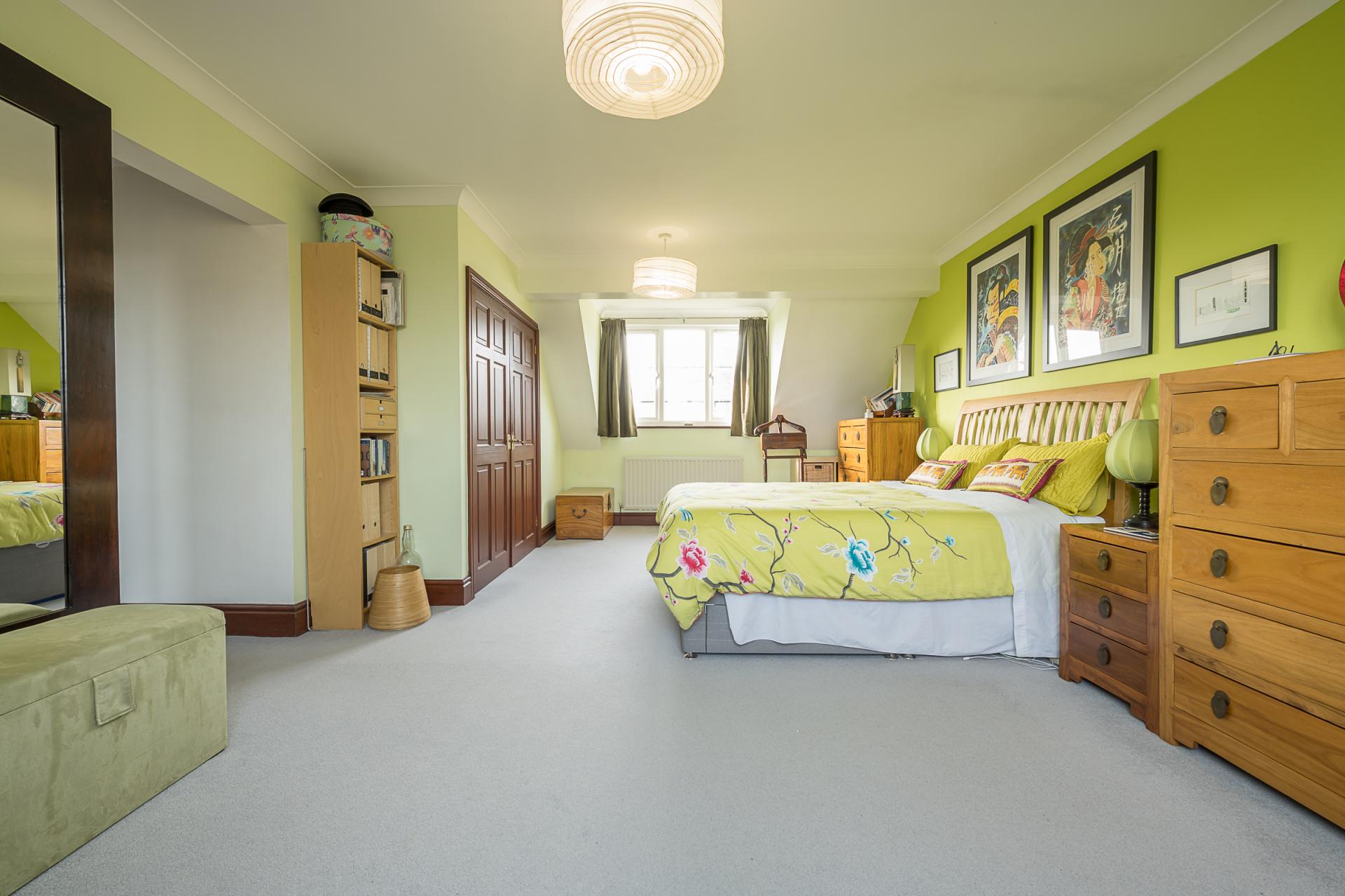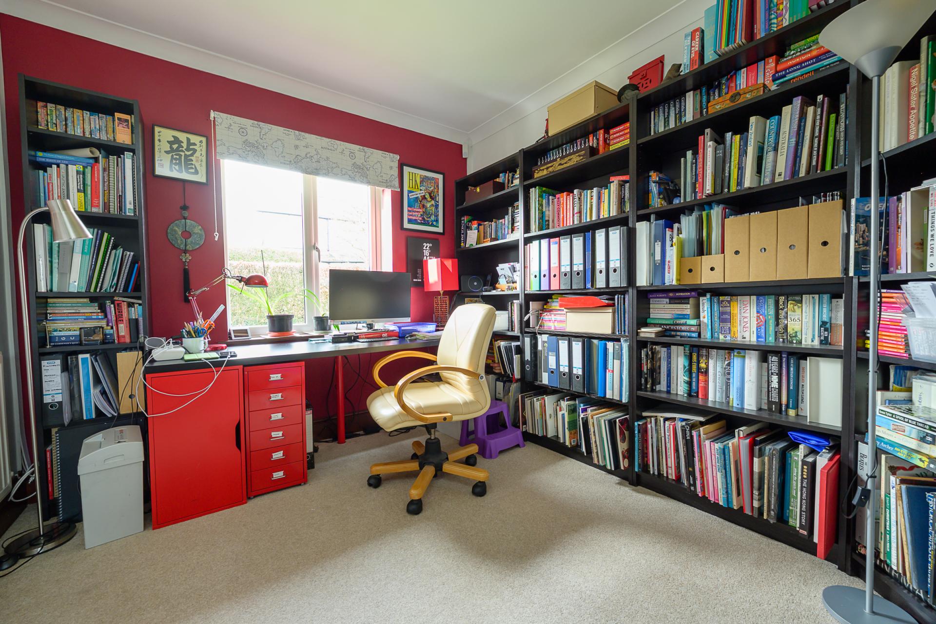Of the remaining reception rooms, one is arranged as a formal dining room, ideal for hosting family meals and entertaining, while the other serves as a study, providing a quiet and well-proportioned space for home working. The study benefits from fitted bookshelves that wrap neatly around one corner of the room.