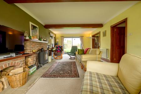From here, the house opens into an airy entrance hall that forms the central flow of the ground floor. This level features three reception rooms, offering flexible living spaces suited to both everyday family life and entertaining. The largest is an impressive triple-aspect sitting room, centred around a wood-burning stove - a comforting staple of rural living - set within a characterful brick fireplace that also incorporates a recess for log storage. Aluminium-framed French doors open from this room onto the rear garden, allowing natural light to cascade into the space.