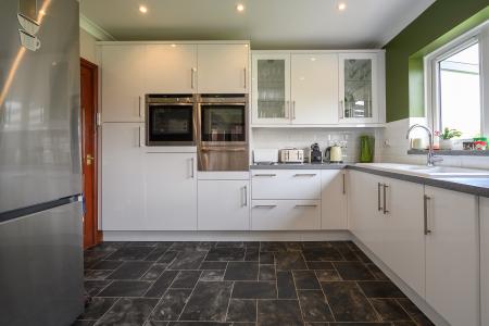 The light and bright kitchen is appointed with high-quality Maia worktops and a range of integrated appliances, including a Neff double oven with warming drawer, a Neff induction hob and a Hotpoint extractor fan. A ceramic sink with a mixer tap is positioned beneath a window overlooking the attractive rear garden. At the far end of the room, a door leads to the utility room, which provides space and plumbing for a washing machine, dishwasher and tumble dryer, along with additional storage and a further sink with a pull-out swivel tap.