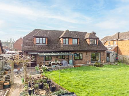 The rear garden features a level lawn alongside a generous patio terrace that runs the length of the house, creating an excellent space for outdoor dining and entertaining. A substantial section of the terrace is sheltered by a veranda, providing welcome shade during warmer months and protection during passing showers - ensuring the space can be enjoyed throughout the British summer.