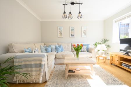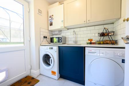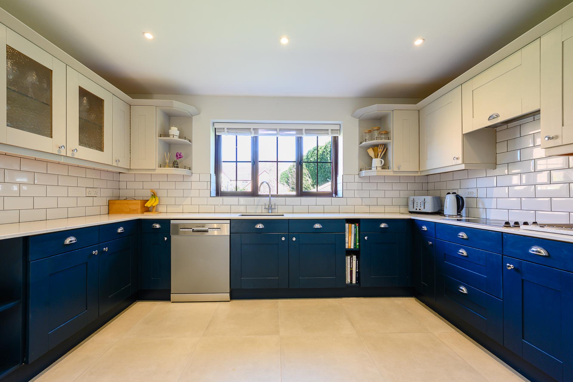 The kitchen is both attractive and highly functional, featuring timeless Shaker-style cabinetry paired with sleek quartz worktops. Integrated appliances include a double Bosch oven, ceramic hob, and fridge/freezer, while a composite sink is perfectly positioned beneath a window framing views of the garden. A separate utility room provides additional practicality, with provision for laundry appliances, further storage, and external access.