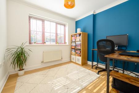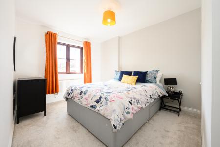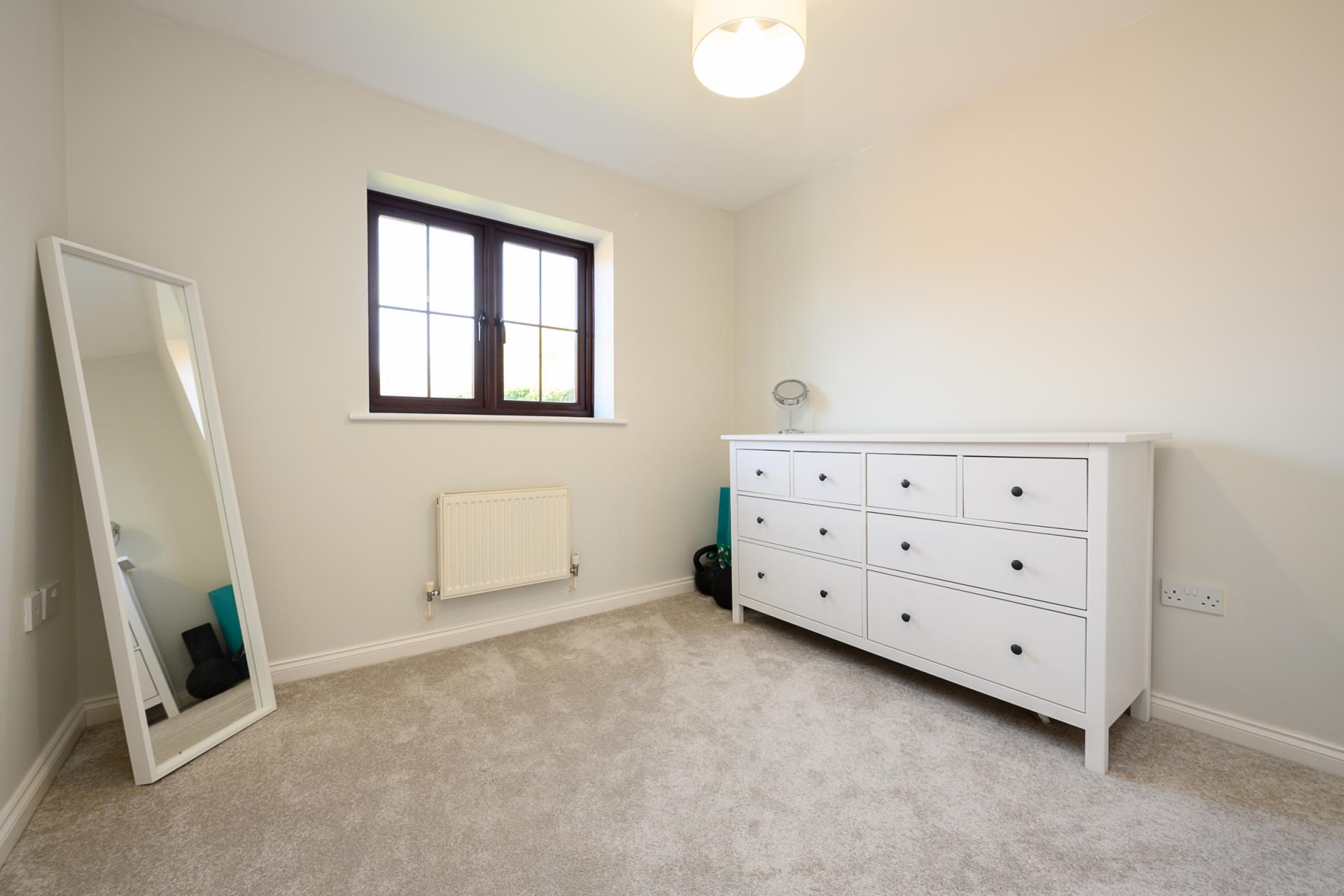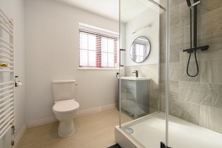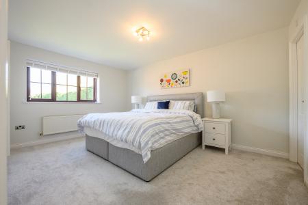 Upstairs, a galleried landing leads to four well-appointed double bedrooms, each benefiting from built-in wardrobes. The principal suite enjoys a peaceful outlook over the rear garden and is complemented by a contemporary en-suite shower room with a three-piece suite. One of the additional bedrooms captures delightful views across a neighbouring paddock-often home to grazing pygmy goats-adding a charming rural touch. The remaining bedrooms are equally well-proportioned. The family bathroom is finished to a high standard, featuring a bath with overhead shower, a countertop vanity unit, and a WC, while an airing cupboard provides practical linen storage.