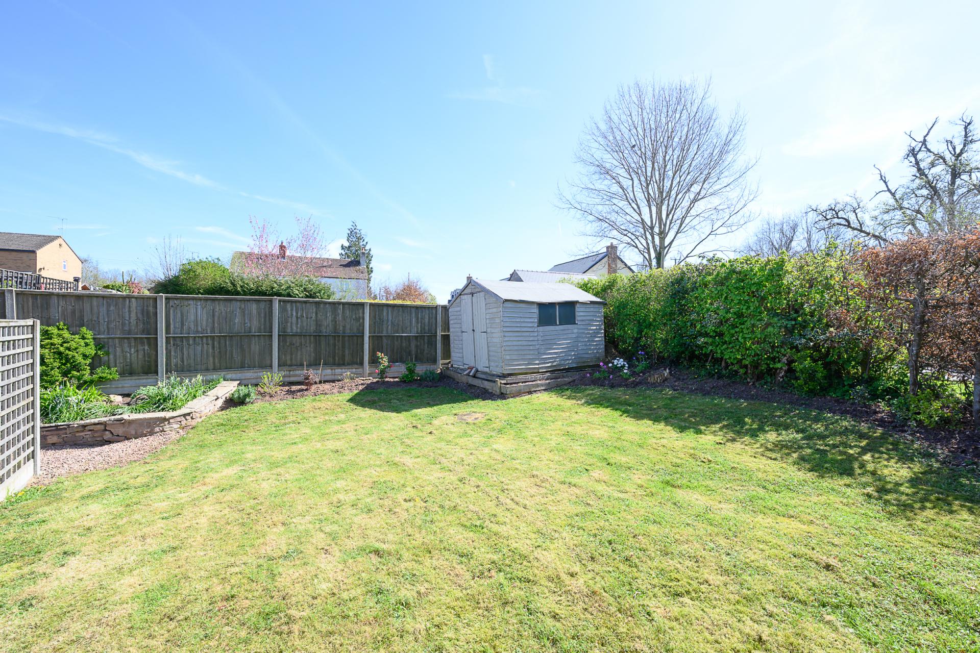 Beyond the garage, an additional section of the garden is laid to lawn and enclosed by mature hedging and closed-board fencing, providing a further sense of seclusion. A practical garden shed offers convenient storage for tools and equipment. The property offers excellent parking provision. A detached double garage, complete with light and power, is currently utilised as a home gym, demonstrating its versatility. Meanwhile, the generous driveway provides ample space for multiple vehicles.