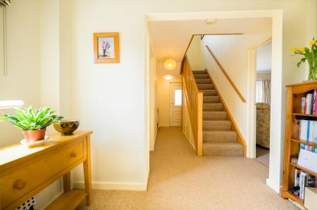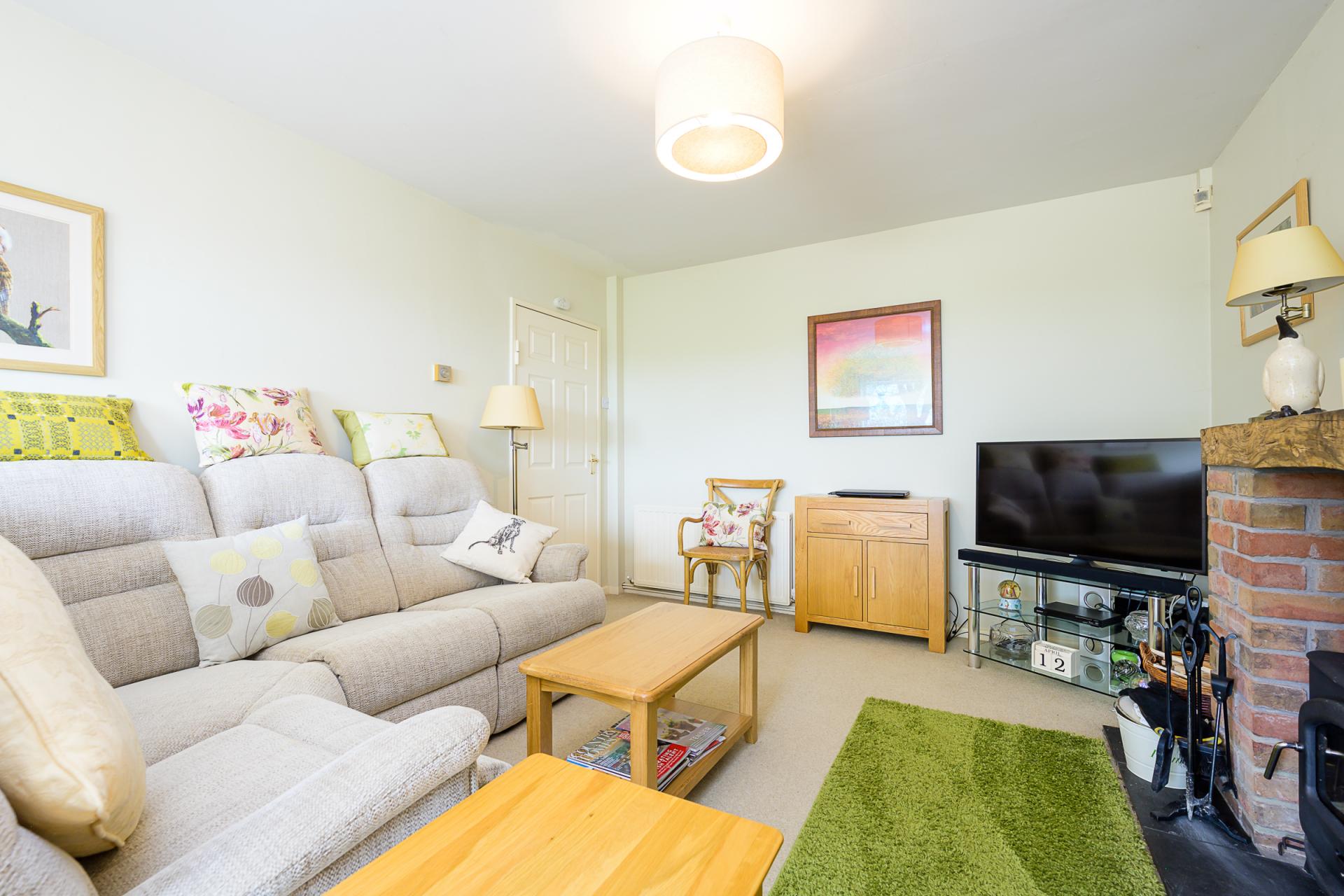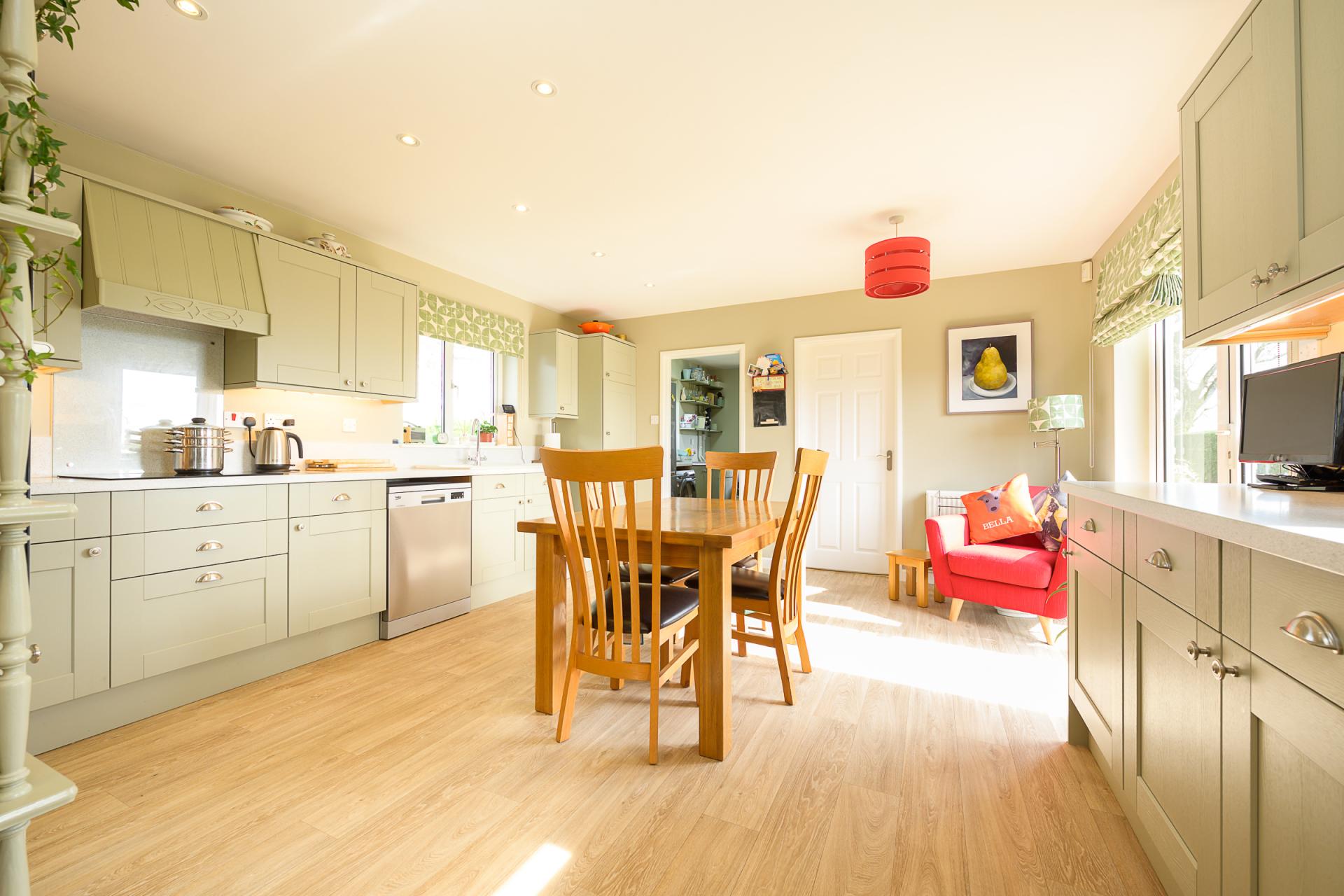 The front door opens into a porch, giving plenty of space to remove boots and coats after time spent enjoying the great outdoors. A handsome reception hall is beyond here, and to the right, there is a beautifully bright, dual aspect sitting room. The main focal point here is an exposed brick fireplace with an oak mantle. This houses a wood burner and creates an alcove for logs. A triple-glazed picture window at the far end, provides an ideal spot to sit and read and showcases the front garden and driveway.