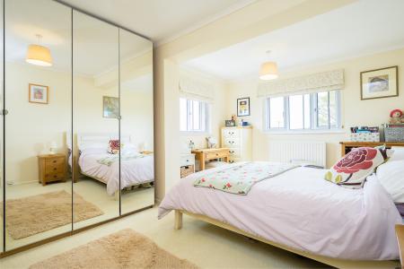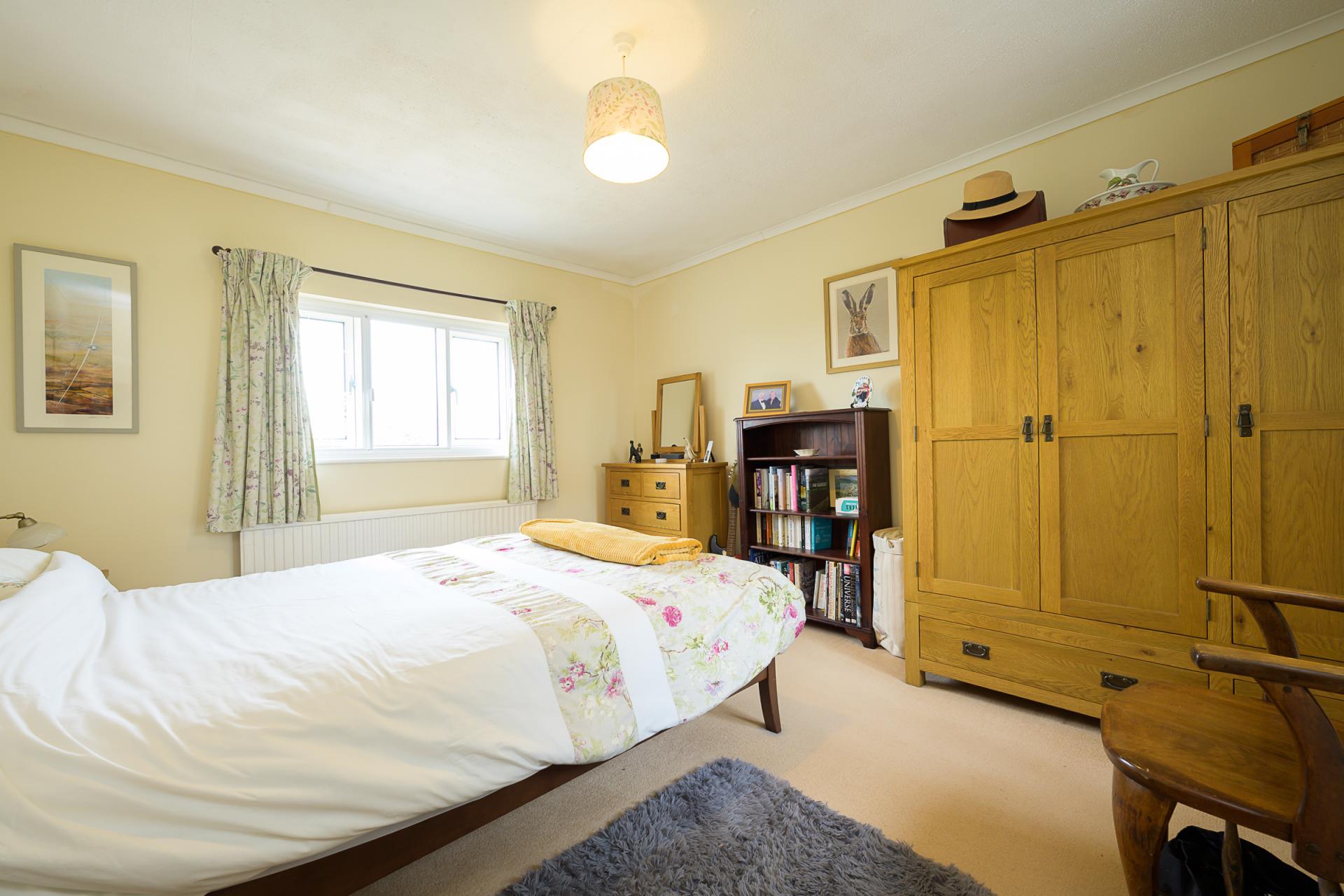 One room becoming a bedroom with adjoining sitting room, and there is an ideally located shower room/WC that can be utilised next door. An oak staircase in the reception hall leads to a galleried landing. The family bathroom and three double bedrooms are all housed on this level of the property. The bedrooms all enjoy plenty of natural light and feature secondary glazing, plus splendid, elevated views. Of these rooms, two are dual-aspect, the largest of which has floor-to-ceiling mirrored fitted wardrobes.