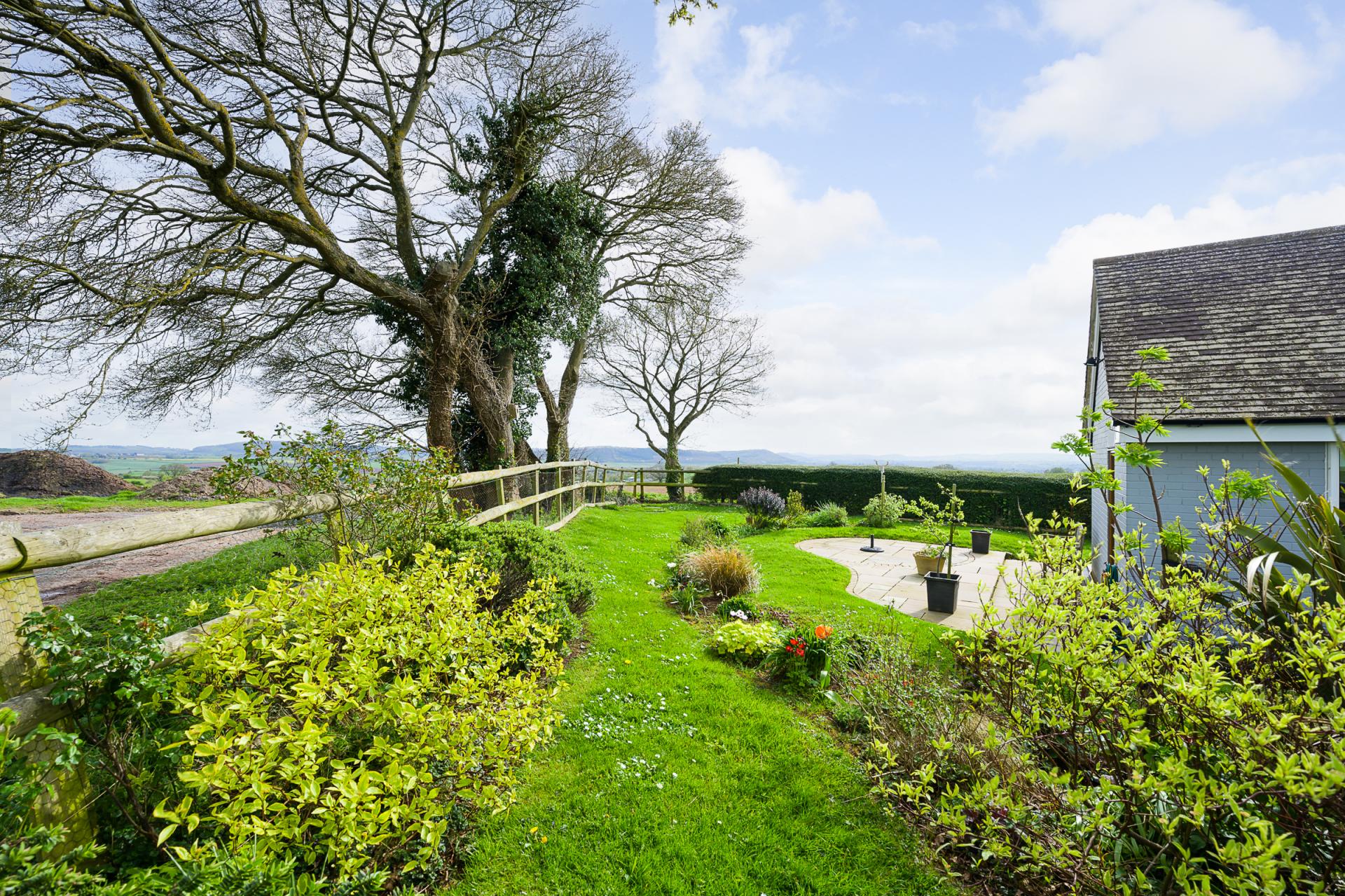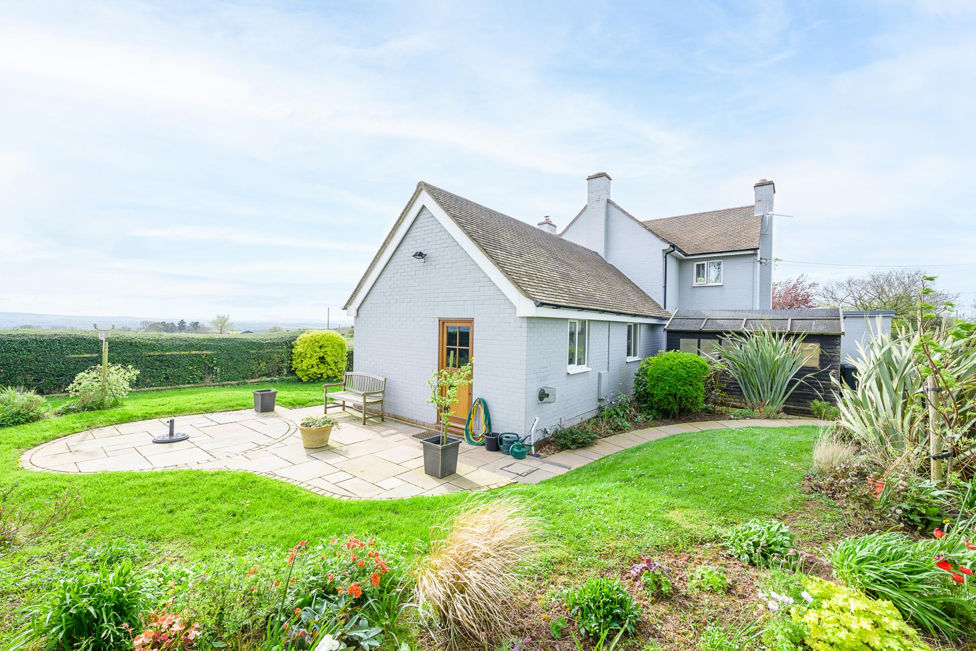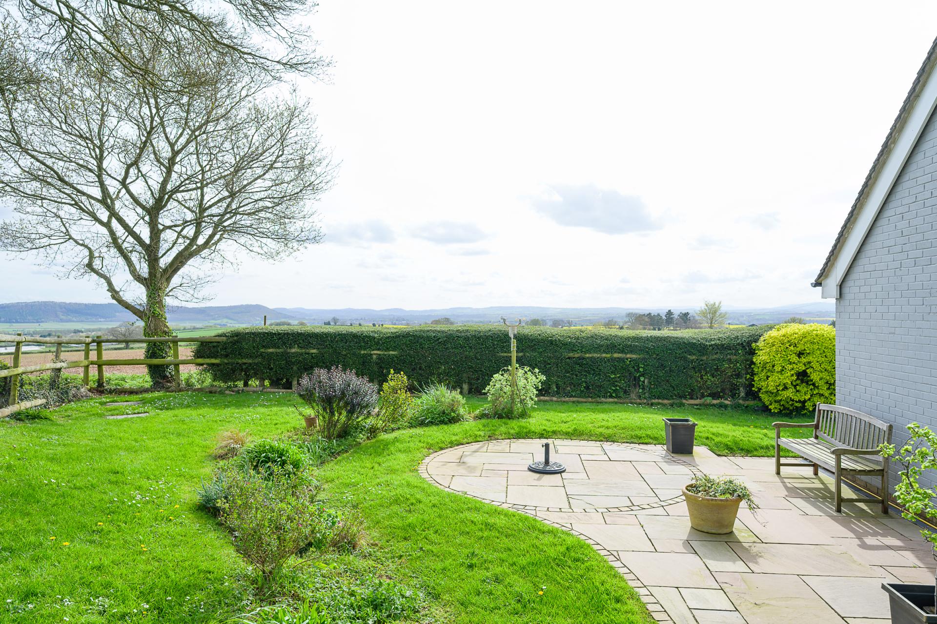 A path meanders through a level lawn, past raised beds which are well-stocked with ornamental plants and vibrant blooms. In the far corner of the grounds, there is a generous patio seating area which overlooks May Hill, Linton Ridge, and Hay Bluff. The rear garden also includes two sheds, and a log store situated at the rear of the oak-framed carport.