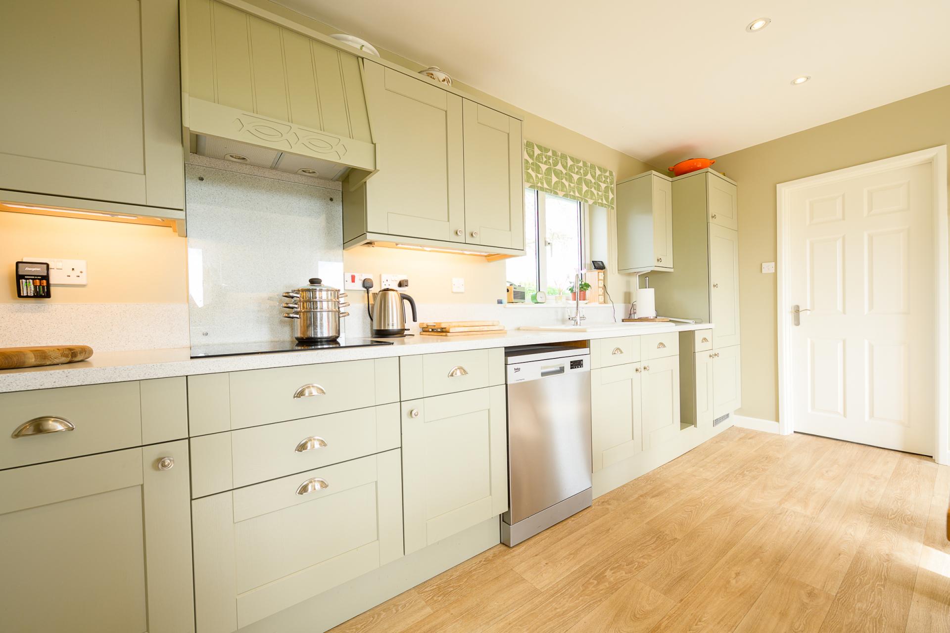The extensive dining kitchen is to be found at the far end of the reception hall and this area offers views to the Welsh Black Mountains, and over the surrounding farmland. The well-appointed kitchen is fitted with base-and-wall-mounted sage green shaker-style Howdens units giving a generous amount of storage space. The kitchen also offers attractive worktops, a deep ceramic sink, a Stoves oven with matching grill, an integrated fridge, an induction hob with a concealed Bosch extractor fan, plumbing for a dishwasher, and ample room for a dining table with chairs in the centre of the space. In the far left-hand corner, a door leads into a recently remodelled utility room, offering space for a fridge/freezer, and plumbing for both a washing machine and tumble dryer. The recently installed high-efficiency Worcester boiler is also housed in this space, and a handmade stable door leads out to the rear garden, with stunning views to May Hill beyond.
