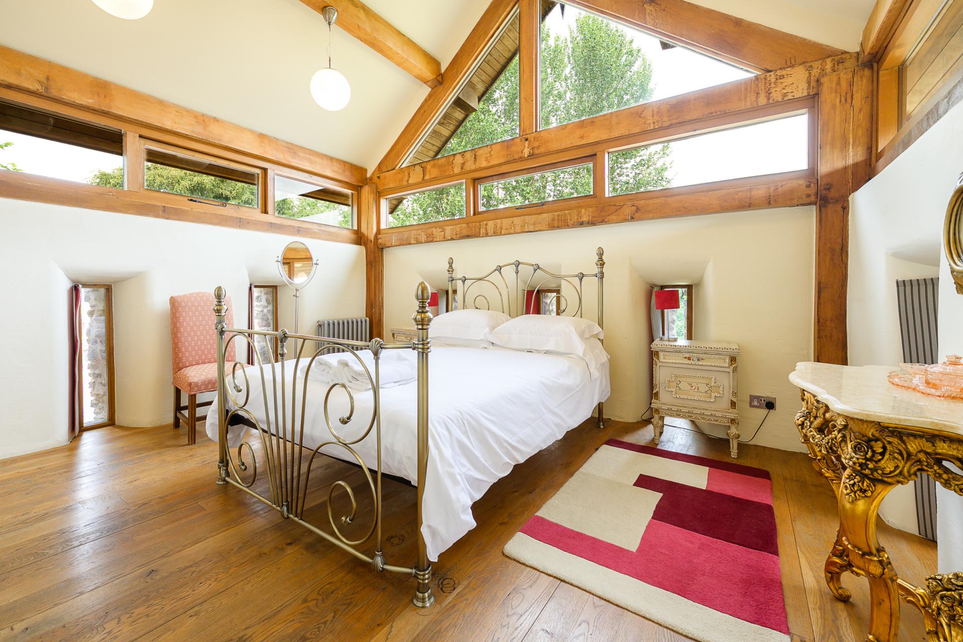 The main entrance into The Great Barn leads into a beautifully bright sitting room, a space that sets an excellent introductory scene. Plenty of natural light cascades into this space through two sets of sliding glass doors, positioned on either side of the room, and one aspect showcases the wondrous countryside view. A slate floor flows throughout this level of the property, into two double bedrooms which sit on opposing ends of the sitting room. Both bedrooms carry characterful arrow-slit windows, built-in cupboards and en-suite facilities; one includes a large step-in rainfall shower, with a countertop vanity unit, a WC and a heated towel rail. The other has a freestanding double-ended bath with a shower attachment, his-and-hers countertop vanity units with illuminated mirrors, a WC and a heated towel rail. A stone spiral staircase in the sitting room leads upstairs to the open-plan living space. A vaulted ceiling with exposed trusses accentuates the generous size of the space, a wooden floor flows throughout the expanse, and a sliding glass door leads to a Juliet balcony, exhibiting the glorious perry orchard. The kitchen area also bears wooden shaker units with granite worktops, a Belfast sink and modern integrated appliances which include an AEG dishwasher, an under-counter fridge and an under-counter freezer. In addition, matching cabinets accommodate a Hotpoint washing machine, the oil boiler and a water cylinder. A door in the far corner of the open-plan space leads through into the light-streamed third bedroom, which also features a vaulted, beamed ceiling. This space bears a built-in wardrobe and an en-suite shower room with a step-in rainfall shower, a countertop vanity unit, a WC and a heated towel rail.