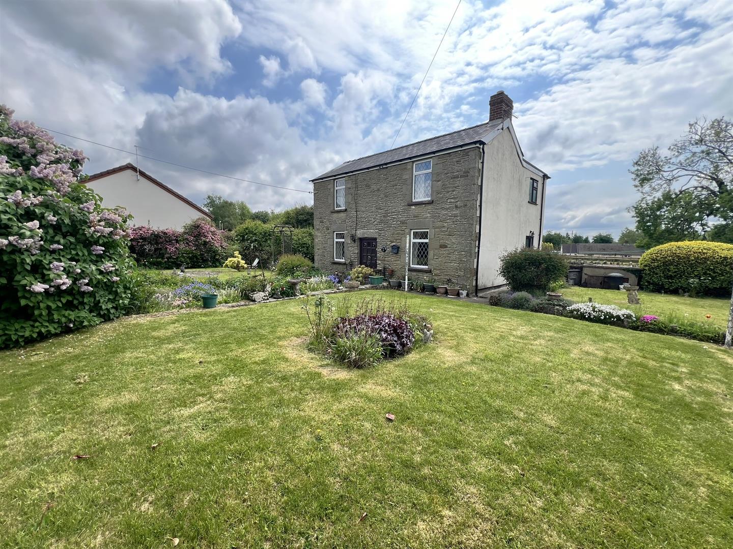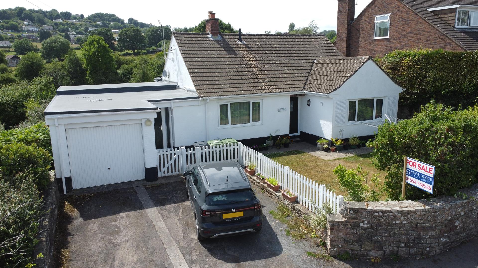 Outside - The property is positioned towards the rear of the plot, with a garden that wraps around the front and sides, enclosed by a surrounding wall. A small pedestrian gate provides access to a pathway leading to the front door and continuing around the property.